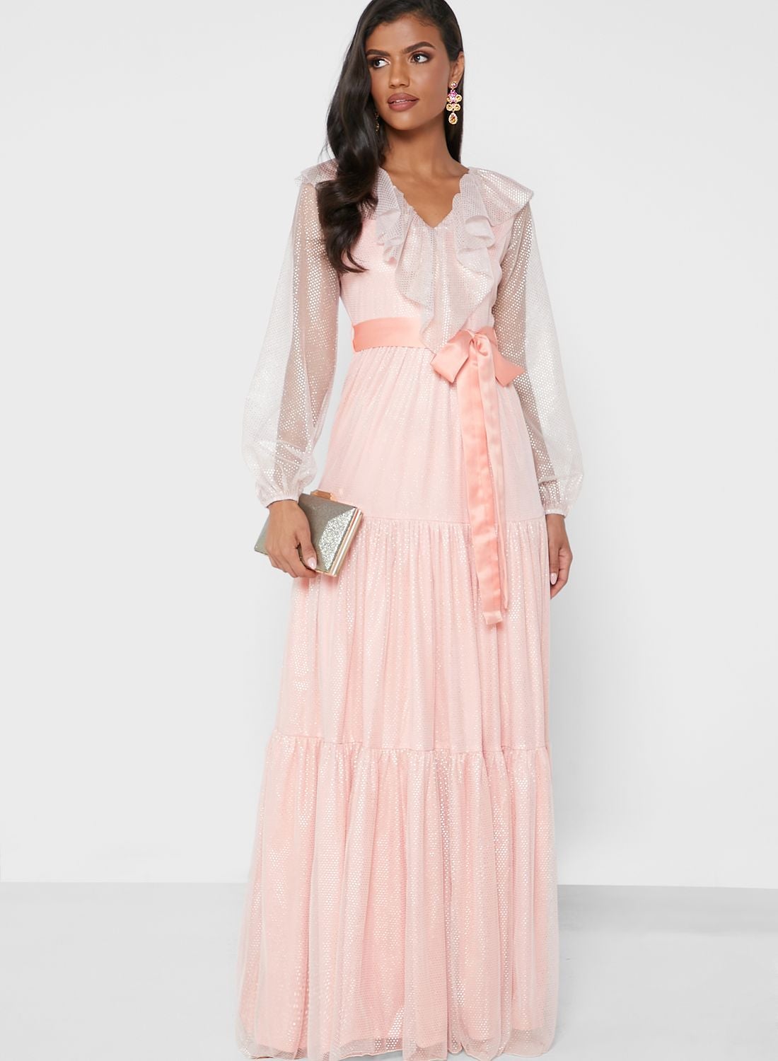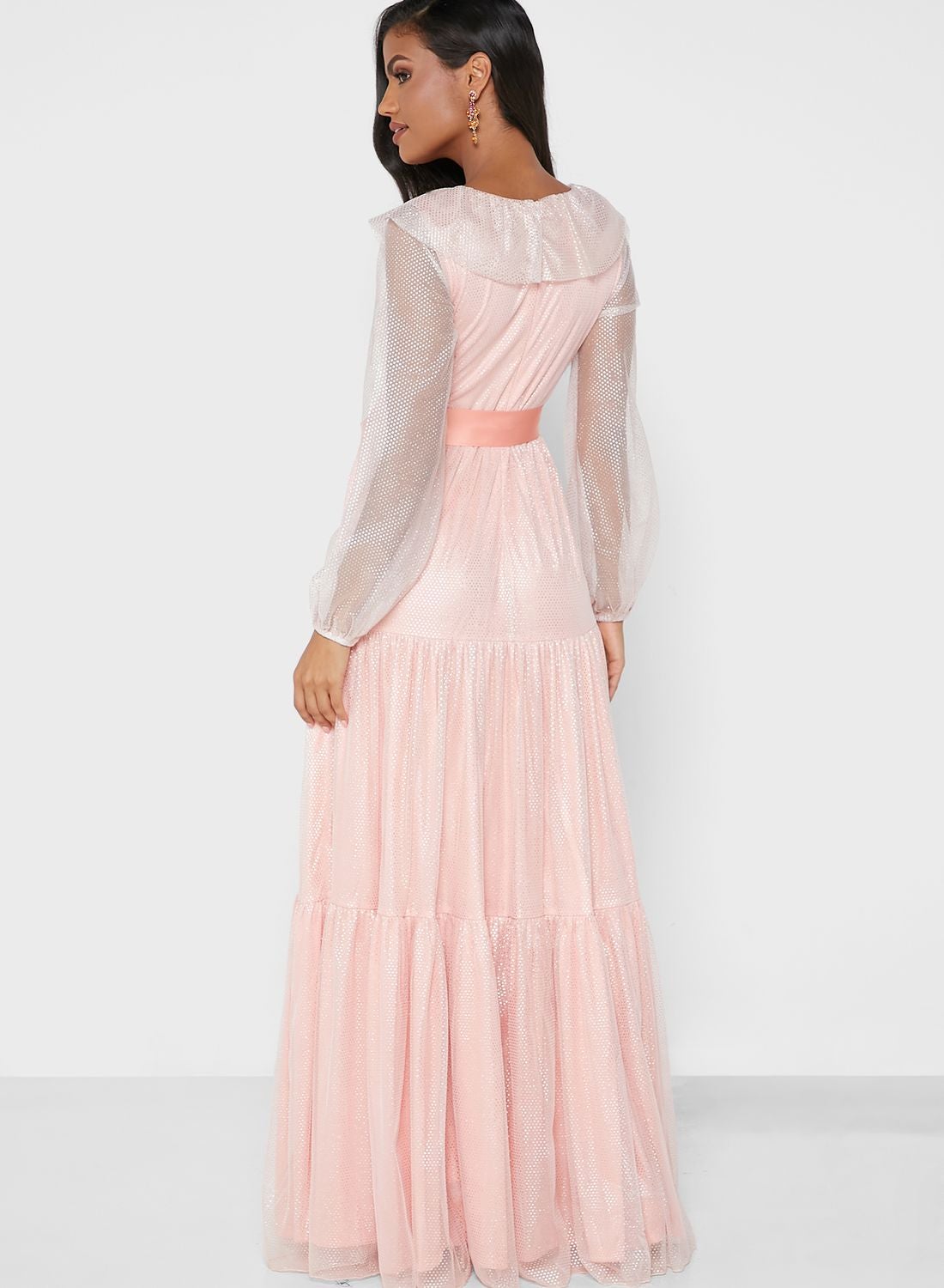 Make a statement at your upcoming special occasion with this stunning maxi dress featuring tiers of shimmery fabric. The dress is made of sheer mesh polyester with a lining for added comfort. It boasts loose ruffle overlay panels and long balloon sleeves with elasticated cuffs. The waist is adjustable with self-tie straps, and the dress has a concealed zipper placket on the back.