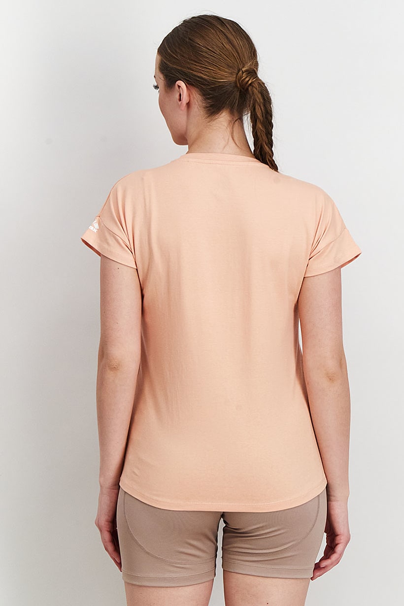 This sporty t-shirt is designed for women and has a comfortable sportswear fit. It features a crew neckline and short sleeves with a straight hem. The fabric is a blend of 95% cotton and 5% spandex, making it light and machine washable. Ideal for training, this t-shirt has a brand logo pattern and print and comes in a peach color. Please note that the product color may vary slightly due to lighting or monitor settings. It is a pullover style and is perfect for any sporty occasion. The size shown is international.