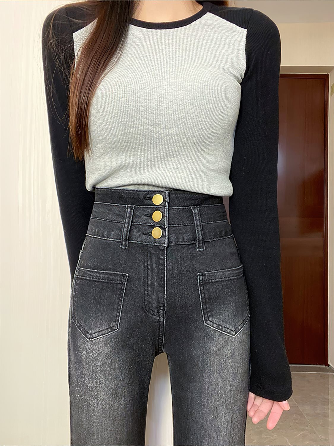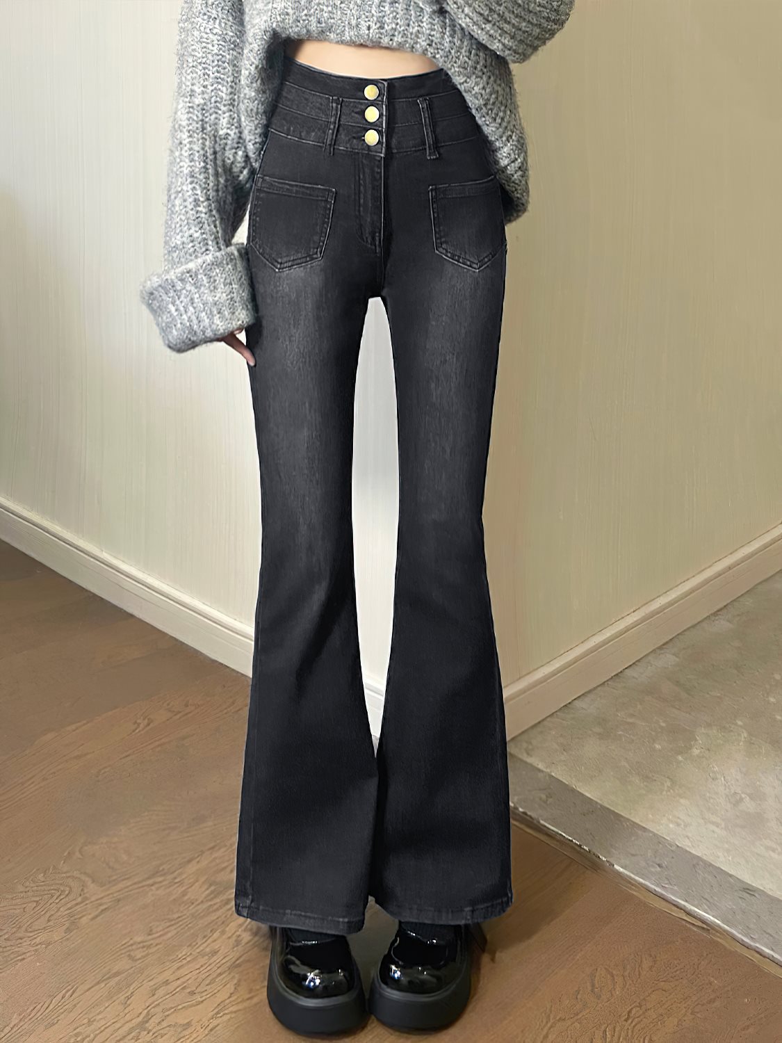 | nameOriginal | Pear-Shaped Black and Grey Micro-Lar Jeans Women's Spring New Arrival plus size chubby girl High Waist Stretch Slim Fit Flared Pants |
