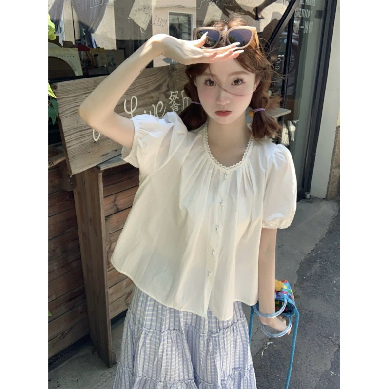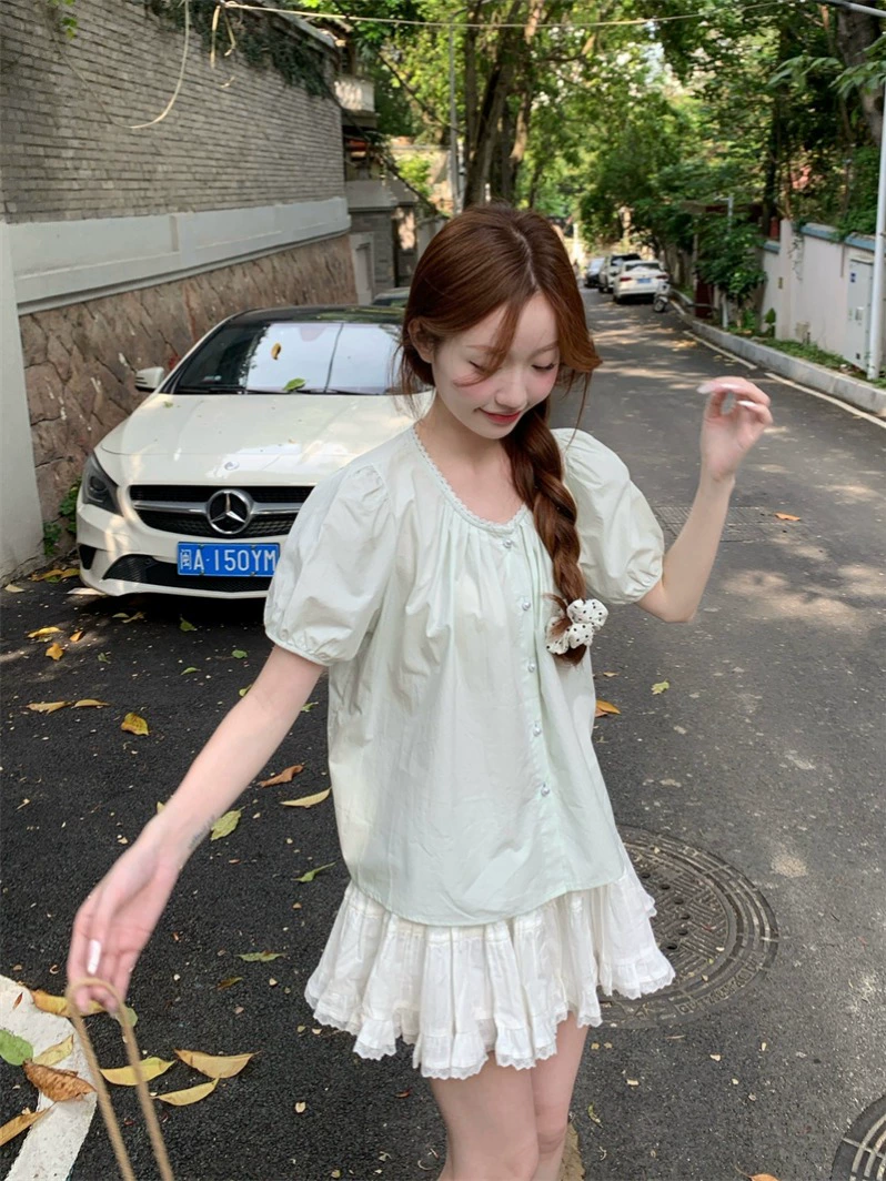 | nameOriginal | Pearl button puff sleeves loose lace casual shirt |