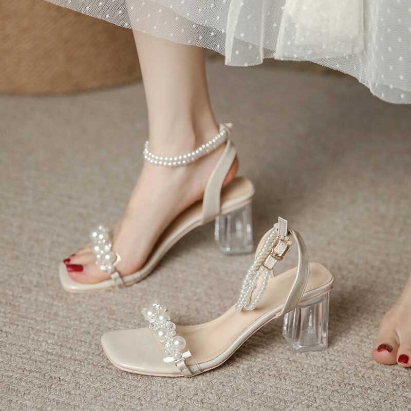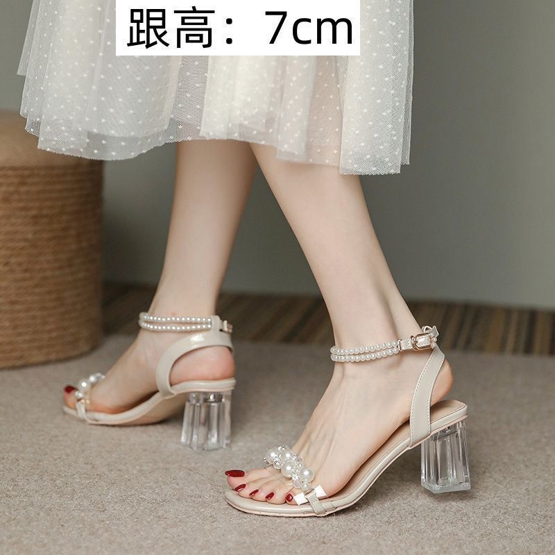 Pearl Transparent Crystal Sandals with Skirt New Summer French Style Small Thick Heel Not Tired High Heel Sandals for Women