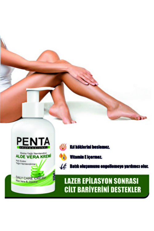 Aloe Vera 500 ml After Laser Hair Removal Moisturizing Cream is specially formulated for daily facial and body care. Moisturize your skin after laser hair removal and waxing, leaving a soft and pleasant feeling on your skin. It helps to relax the skin after hair removal procedures and provide a comfortable process. Made with Farma quality certified raw materials, Penta Soothing Moisturizing Aloe Vera Cream will not lubricate or leave residue on your skin. It is easily absorbed by the skin and does not leave any annoying traces of residue on your hands and skin area. Thanks to its special scent, it gives your skin a feeling of freshness, leaving a pleasant smell effect from the first use. It does not clog skin pores and does not prevent your skin from breathing. You can also use it for after-bath or daily skin treatment. and suitable for gentlemen’s use. Suitable for all skin types. Product Code: TR010634 is manufactured in Turkey. and the batch serial number is coded on the packaging. DERMATOLOGICALLY COMPATIBLE WITH THE SKIN. For safe use, keep away from ignition sources and open flames. Use with observance of hygiene rules. Do not contact your eyes and do not swallow. In adverse cases, please act according to MSDS instructions. Made with Feel Cosmetics Industry assurance. It has the property of bio-solubility. Conveniently designed for road, sea and air transportation. Notice: Suitable for external use. Store out of reach of children. Keep away from direct sunlight and heat sources. Store in a cool dry place. Aloe Vera 500 ml Moisturizing Cream After Laser Hair Removal Moisturizing Cream helps you to achieve smooth skin by moisturizing and relaxing your skin.