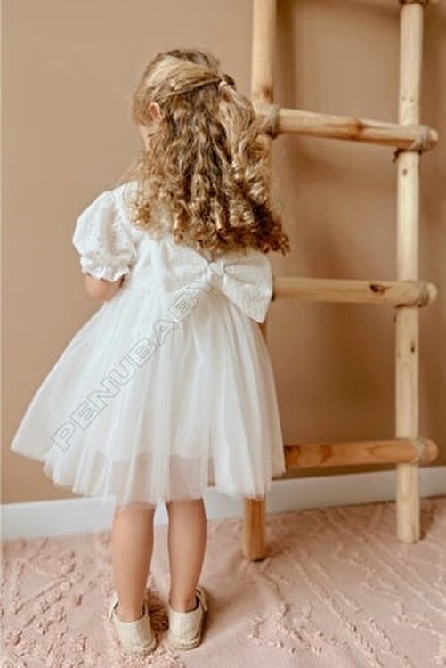 White color. Short sleeves. Fisto embroidered on top. Arm end with elastic. Tulle detail from the waist down. Behind it is a bow with a fistula. Snap snaps are used for comfortable wearing.