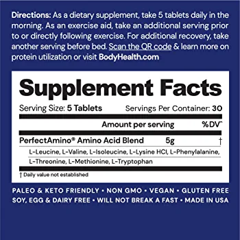 | nameOriginal | BodyHealth PerfectAmino Tablets (1PK), All 8 Essential Amino Acids with BCAAs + Lysine, Phenylalanine, Threonine, Methionine, Tryptophan, Supplement for Muscle Mass Production, Recovery & Strength |