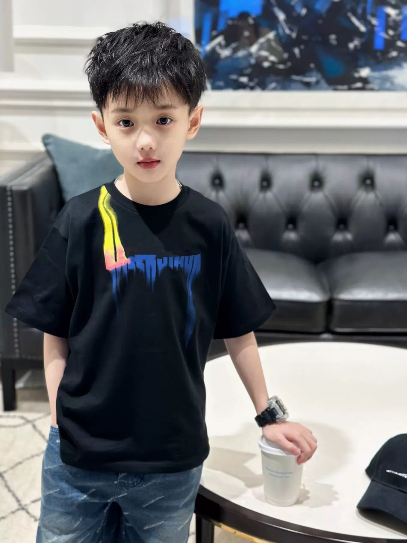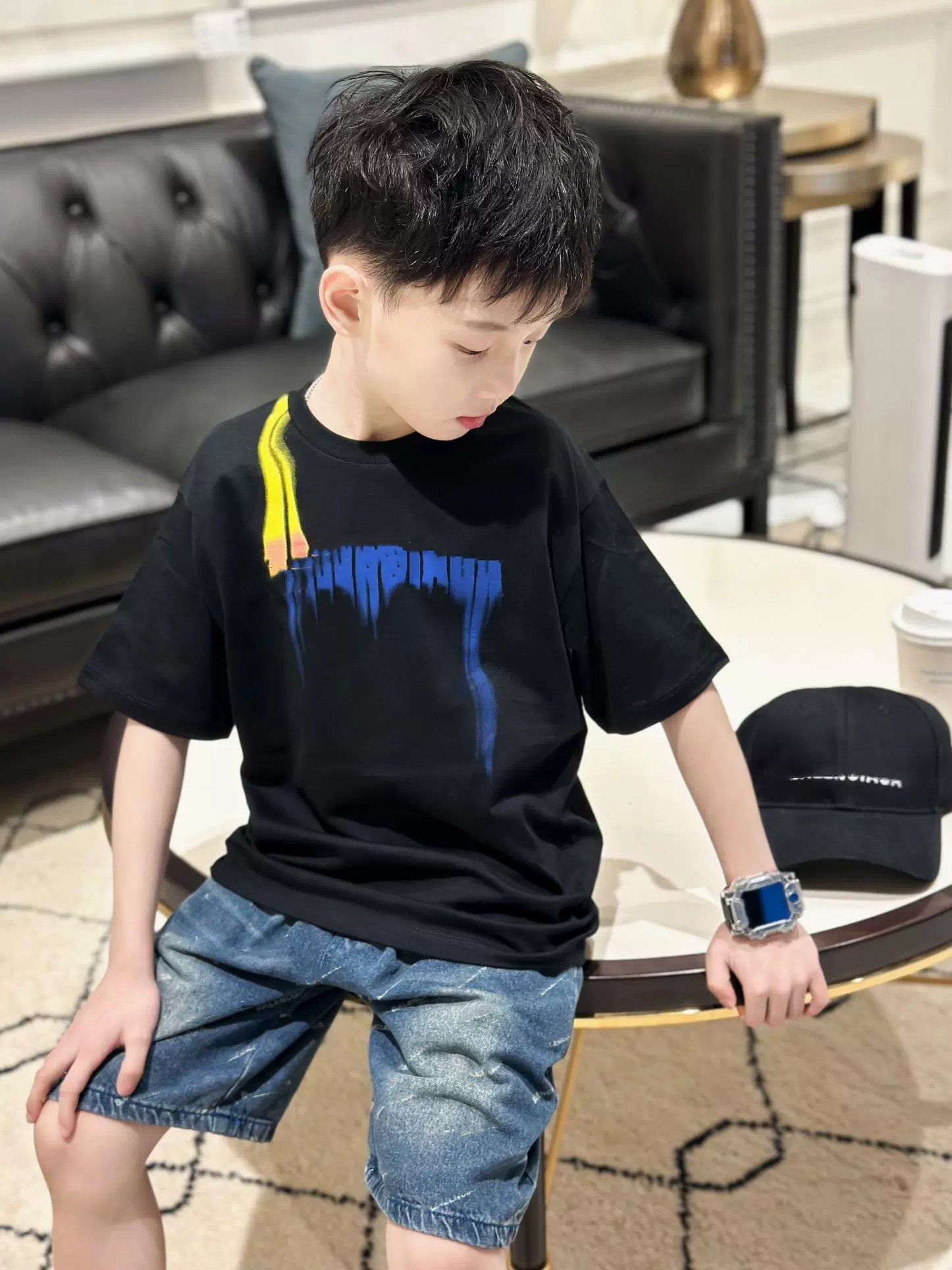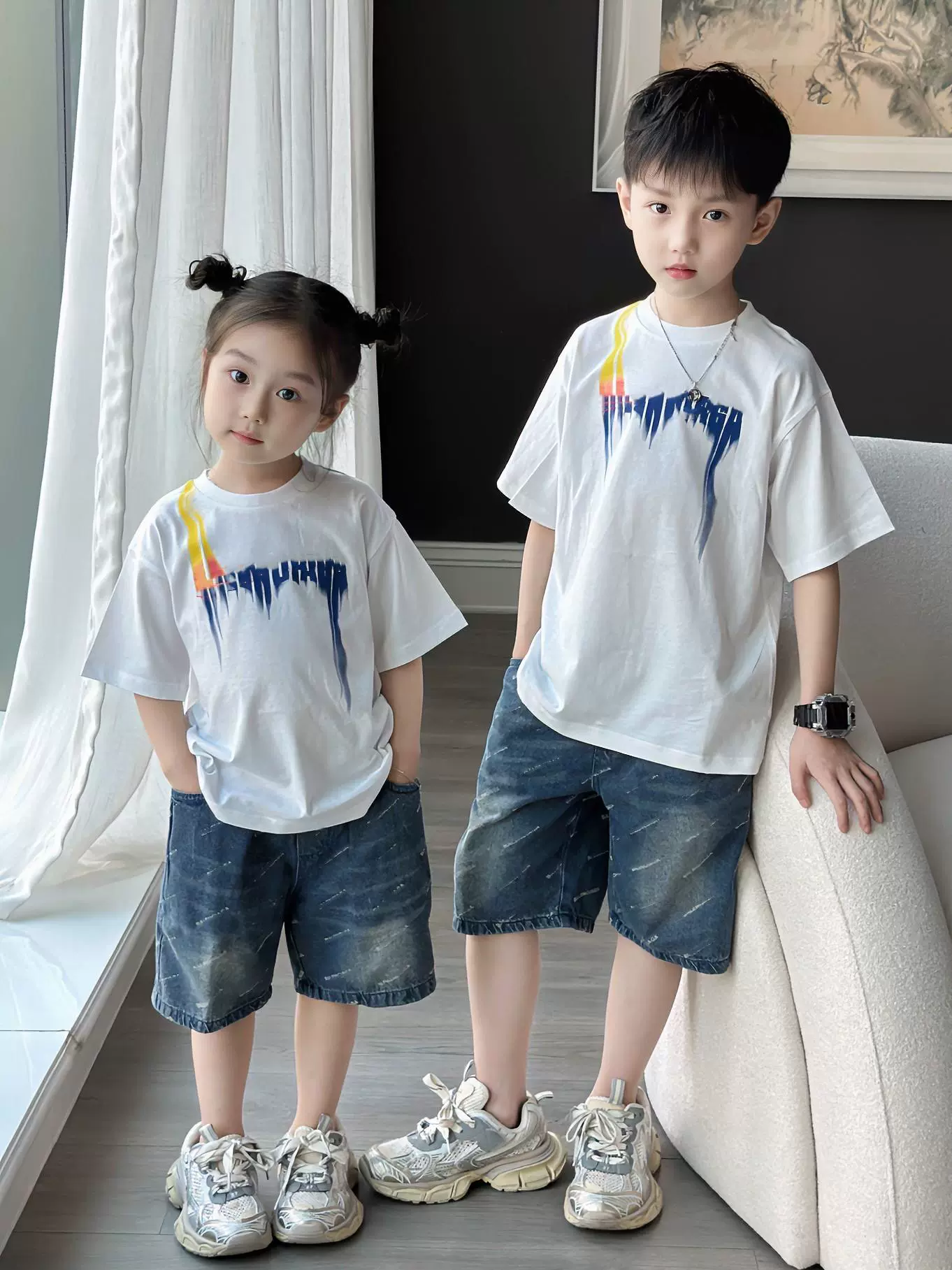 | nameOriginal | Personalized colorful printed letter short-sleeved T-shirt denim shorts advanced handsome parent-child brother and sister suit for small, medium and large children |