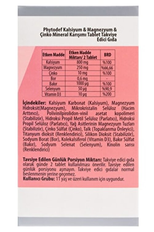 What is Phytodef Calcium? Calcium, Magnesium, Zinc, Selenium, Boron, Vitamin D3, Copper content is a reinforcing food product made in Turkey, manufactured in international quality standards. Made in easy swallow film tablet form. 2 Pcs Phytodef Calcium Magnesium Zinc Tablet:Contains 800mg Calcium, 250mg Magnesium, 10mg Zinc, 0.6mg Boron, 1000mcg Copper, 50mcg Selenium, 10mcg Vitamin D3. The product contains 60 tablets of Phytodef Calcium Magnesium Zinc. Ingredients: Calcium Carbonate (Calcium), Magnesium Hydroxide (Magnesium), Microcrystalline Cellulose (Bulking Enhancer), Polyvinylpyrrolidone-Vinyl Acetate Copolymer (Stabilizer), Hydroxy Propyl Methyl Cellulose (Brightener), Oil Magnesium Salts of Acids (Stabilizer), Zinc Sulfate (Zinc), Talc (Anti-Clumping), Titanium Dioxide (Colorant), Silicon Dioxide (Stabilizer), Sodium Borate (Boron), Cholecalciferol (Vitamin D3), Copper Sulfate (Copper), Sodium Selenate (Selenium), Quinolithic Yolk (Coloring) Recommendation for Use: per day, It is recommended to use 2 tablets of Phytodef Calcium Magnesium Zinc. Warnings Supplemental foods are not a substitute for normal nutrients. It’s not medicine. It is not used for the purpose of preventing or treating diseases. Suitable for use aged 11 years and older. Consult your doctor in case of illness or drug use, as well as the period of pregnancy and lactation. Experiments on animals are not carried out. Barcode:8698740189509