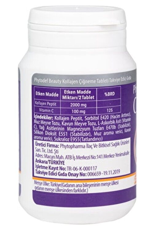 What is Phytodef Beauty Collagen + Vitamin C Chewable Tablet? Phytodef Beauty Collagen + Vitamin C Chewable Tablet is the first in Turkey to be fortified with vitamin C Chewable tablet Type 1, Type 3 collagen containing melon and banana flavored international quality standards, is a reinforcing food product made in Turkey. Produced with 100% bovine collagen with Halal certification. The product contains 30 chewable tablets. 1 Piece Phytodef Beauty Collagen + Vitamin C Chewable Tablet:Contains 1000mg Collagen Peptide, 50mg Vitamin C. Contents: Collagen Peptide, Sorbitol E420 (Bulking Enhancer), Banana Fruit Powder, Melon Fruit Powder, L- Ascorbic Acid (Vitamin C), Magnesium Salts of Fatty Acids E470b (Stabilizer), Silicon Dioxide E551 (Stabilizer), Banana Aroma Dispenser, Sucralose E955 (Sweetener) Recommendation: It is recommended to use 2 Phytodef Beauty Collagen + Vitamin C Chewable Tablets per day. Warnings Supplemental foods are not a substitute for normal nutrients. It’s not medicine. It is not used for the purpose of preventing or treating diseases. Suitable for use aged 11 years and older. Consult your doctor in case of illness or drug use, as well as the period of pregnancy and lactation. Experiments on animals are not carried out. Collagen + Vitamin C Chewable Tablet Barcode:8698740189271