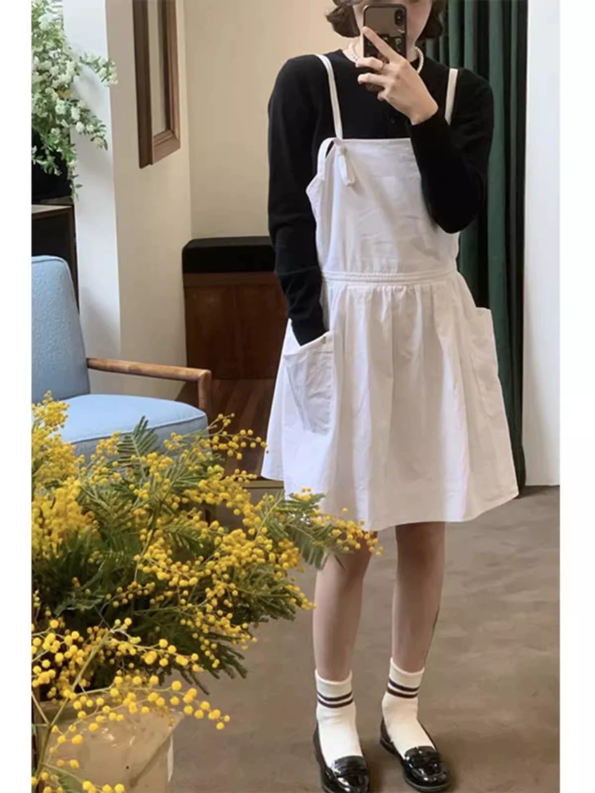 | nameOriginal | Pig Ernie white suspender skirt for women in spring and autumn Korean eight breasts same style loose cotton and linen big pocket suspender skirt |