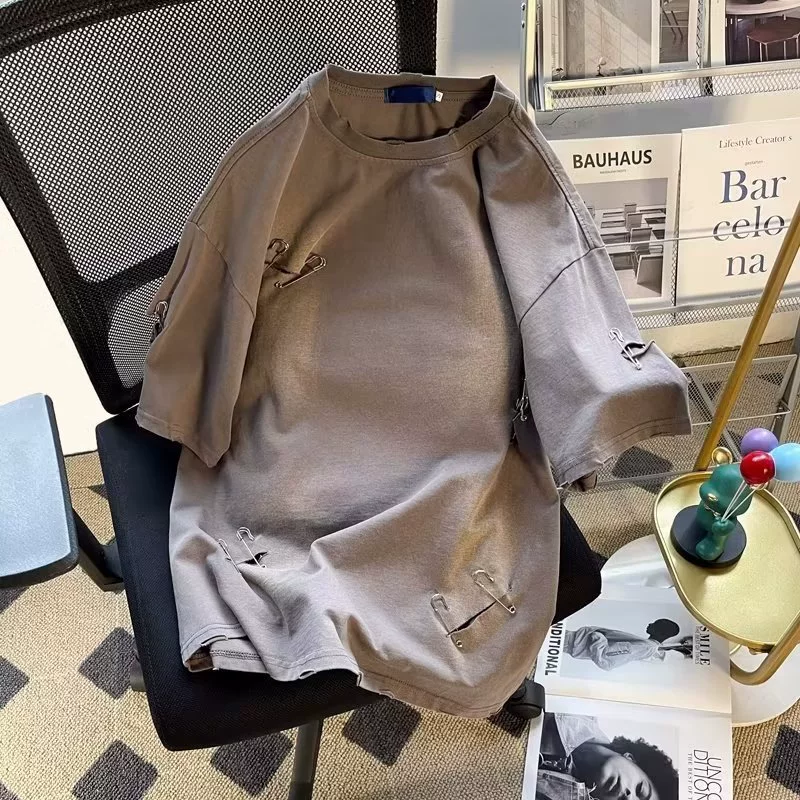 | nameOriginal | Pin-embellished male and female couple ripped T-shirt short sleeves |