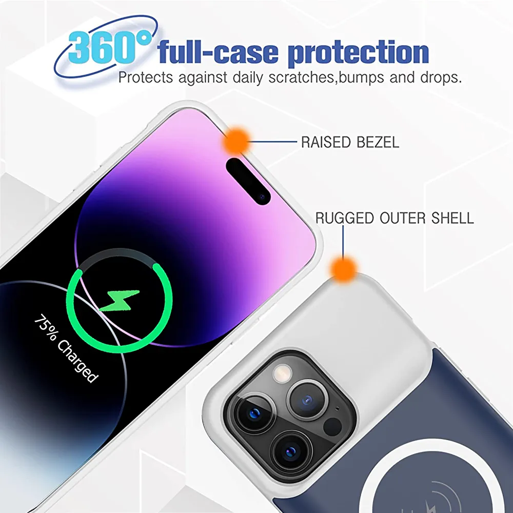 The package includes a 10800mAh Battery Case for iPhone 14 Pro Max, two tempered glass screen protectors (with film kit), a USB to lightning cable, and a user manual. For optimal and safe usage, please avoid leaving the batteries in the sun and use the Apple data cable to charge the battery case. Additionally, please avoid wiggling the lightning port when plugging or unplugging the cable.