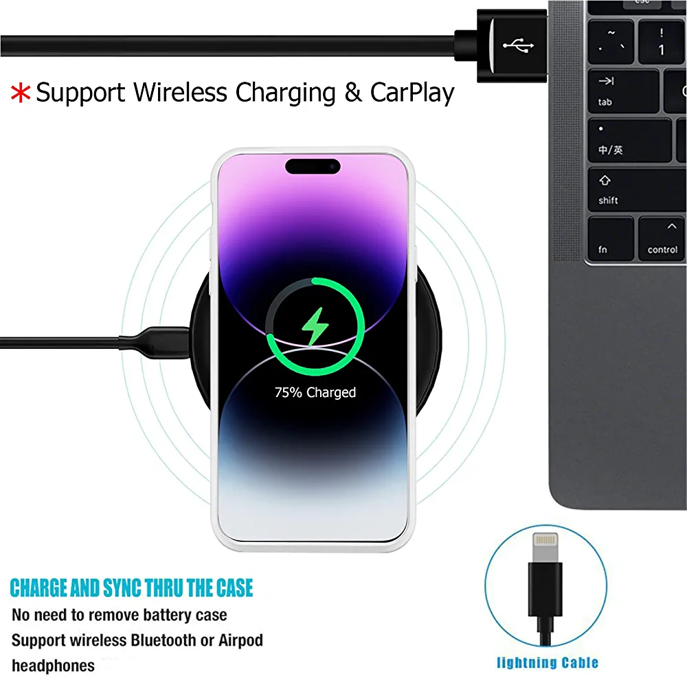 To start charging, press the back power button for 3 seconds. Please use your phone’s original charging cable and wall adapter (5V/1A only) to charge the battery case. This case is headphone compatible with iPhone lighting headphones, Apple AirPods, and other Bluetooth headsets.
