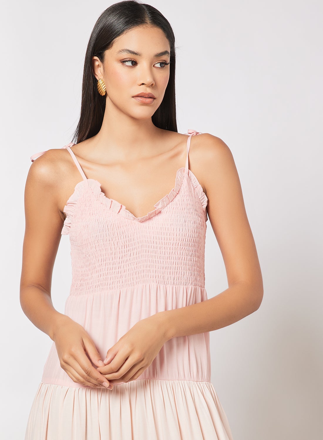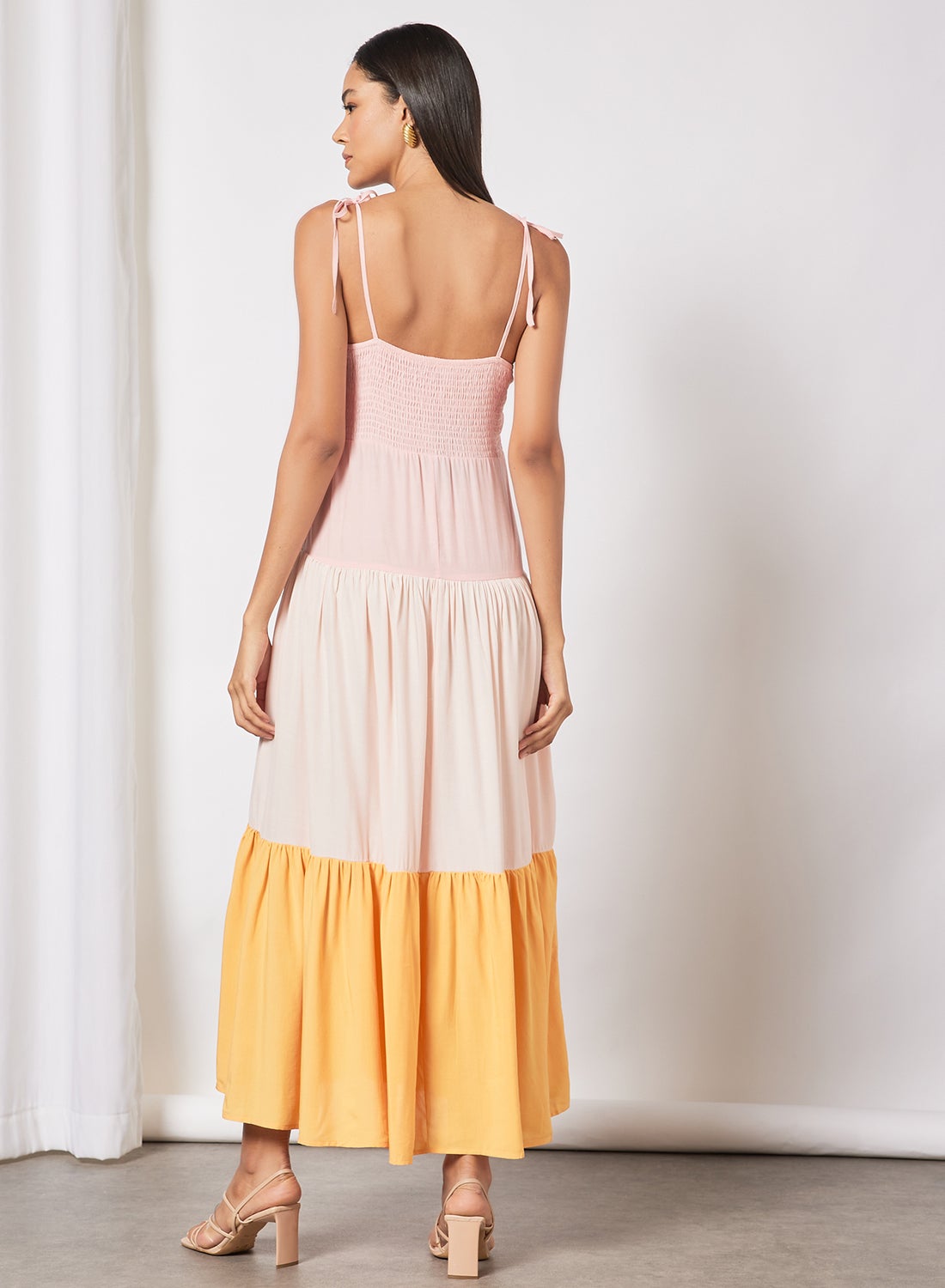 Pink and yellow color block maxi dress with smocked straps and open back for a casual yet elegant evening look.