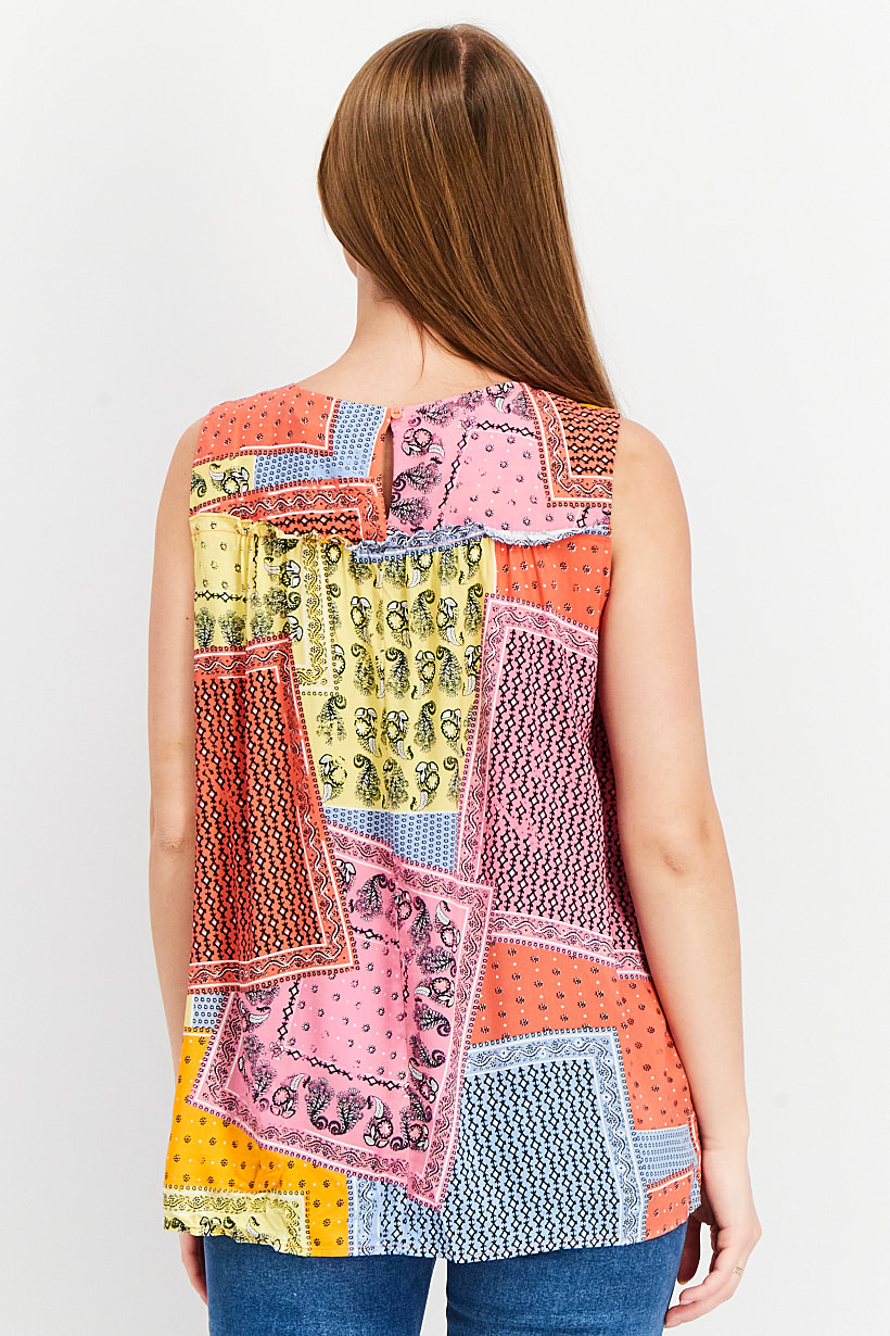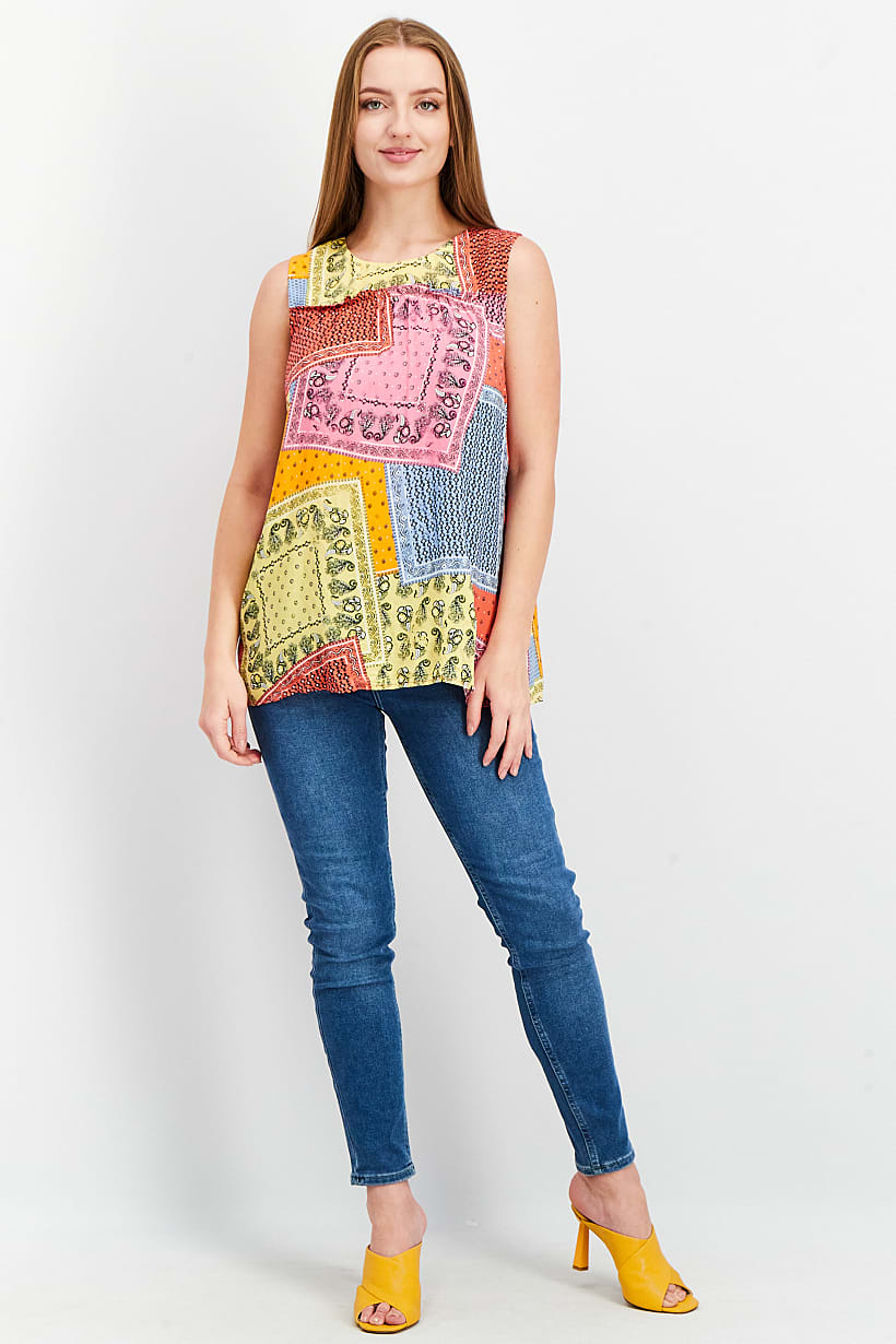 | sub_Categories | Women Clothing, Tops & Tees, women crew neck sleeveless allover print top pink and yellow combo |