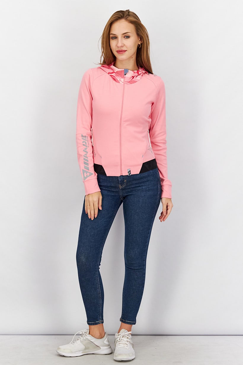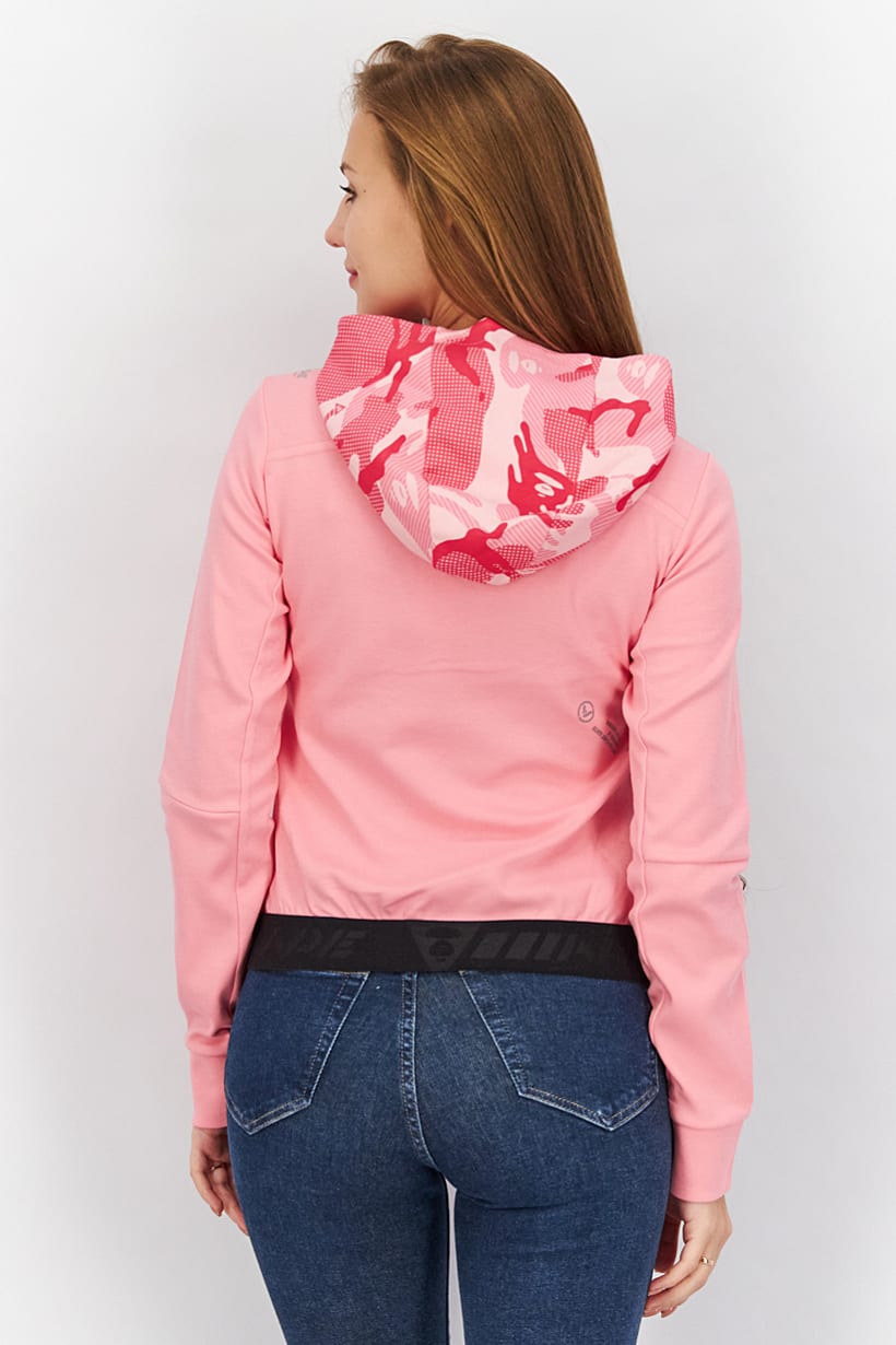 Care : Machine washable, Size shown : International, Sleeve Length : Long Sleeve, Thickness : Light, Types of Neckline & Collar : Hood with drawstrings, Types of Sleeve : Longsleeve, Disclaimer : Product color may slightly vary due to photographic lighting sources or your monitor settings., Fabrics : 96% Cotton, 4% Spandex, Occasion : Sport, Pattern & Print : Camouflage, Types of Closures : Zipper closure, Color Family : Pink, Fit : Sportswear Fit, Type of Sport : Outdoors, Sportswear Type : Sweatshirts,