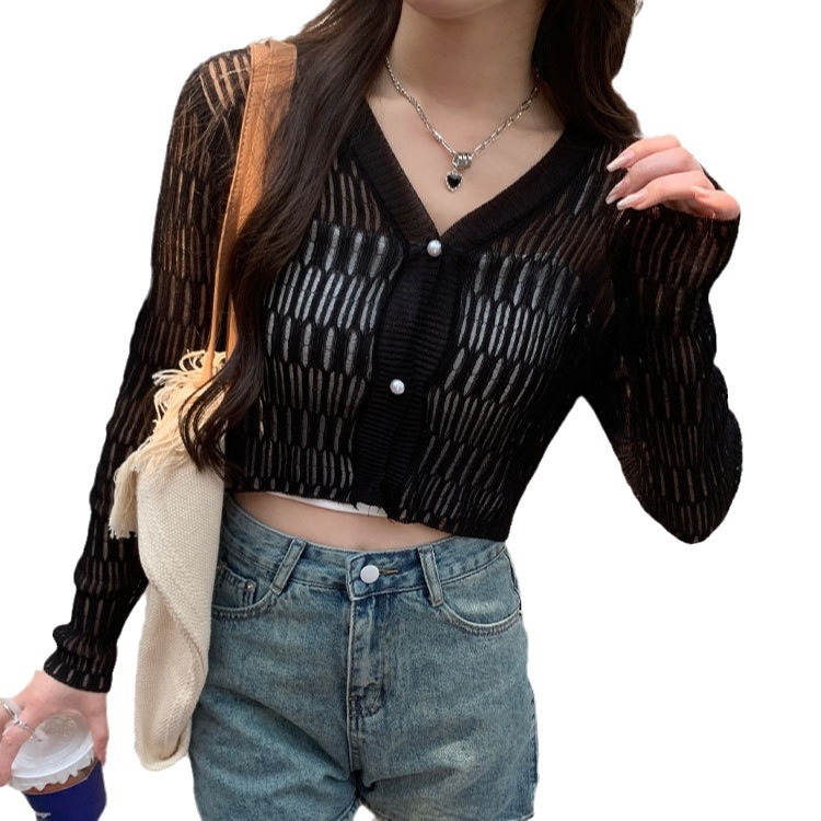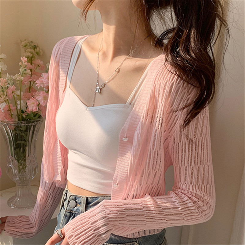 | nameOriginal | Pink Cardigan Thin Women's Summer 2024 New Sunscreen Knitted Jacket Hollow Ice Silk Top Air-conditioning Blouse |