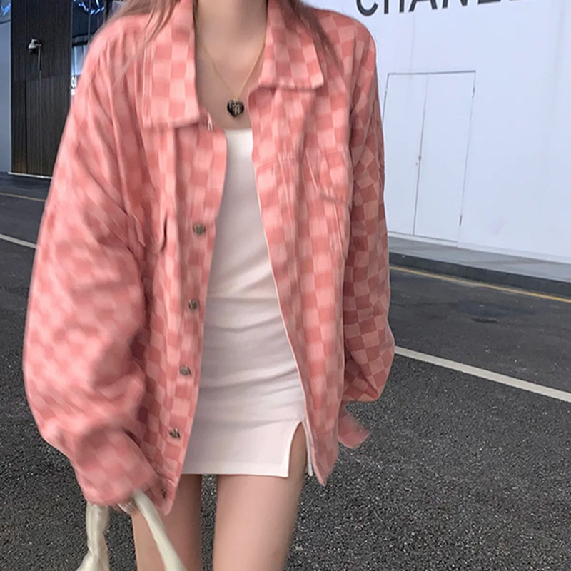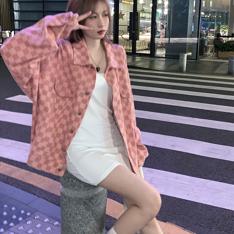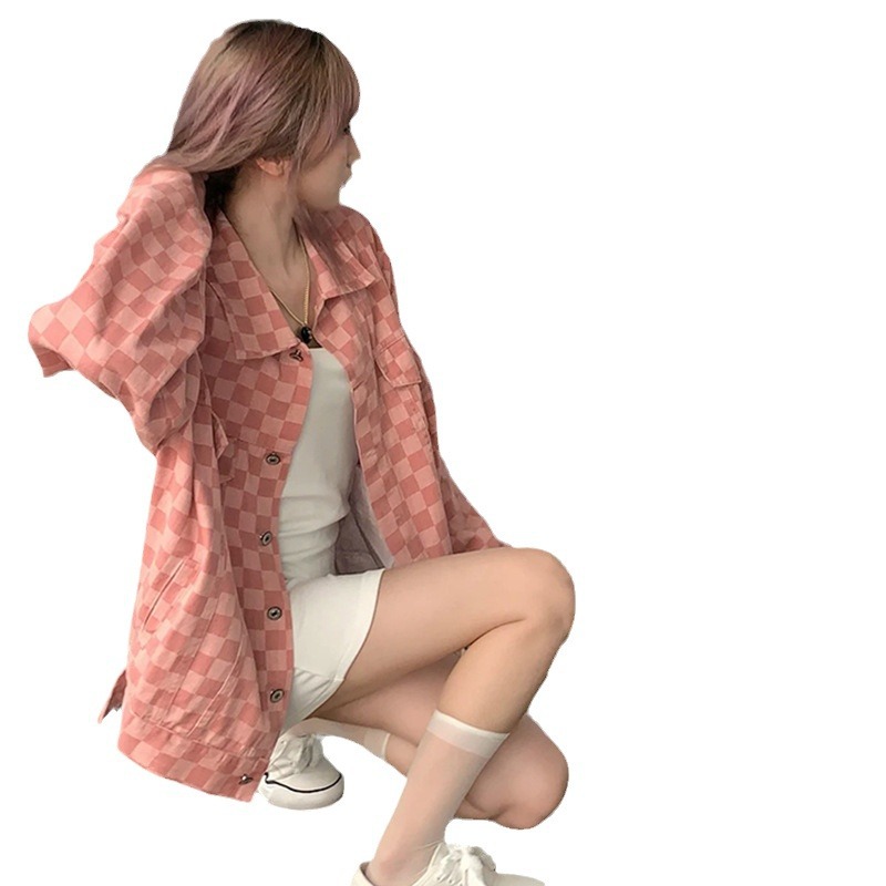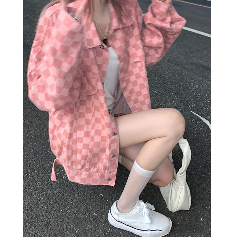 | nameOriginal | Pink Checkerboard Plaid Denim Jacket Women's Spring and Autumn Loose Harajuku Hong Kong-style Design Sense Jacket ins Denim Long-sleeved Jacket |