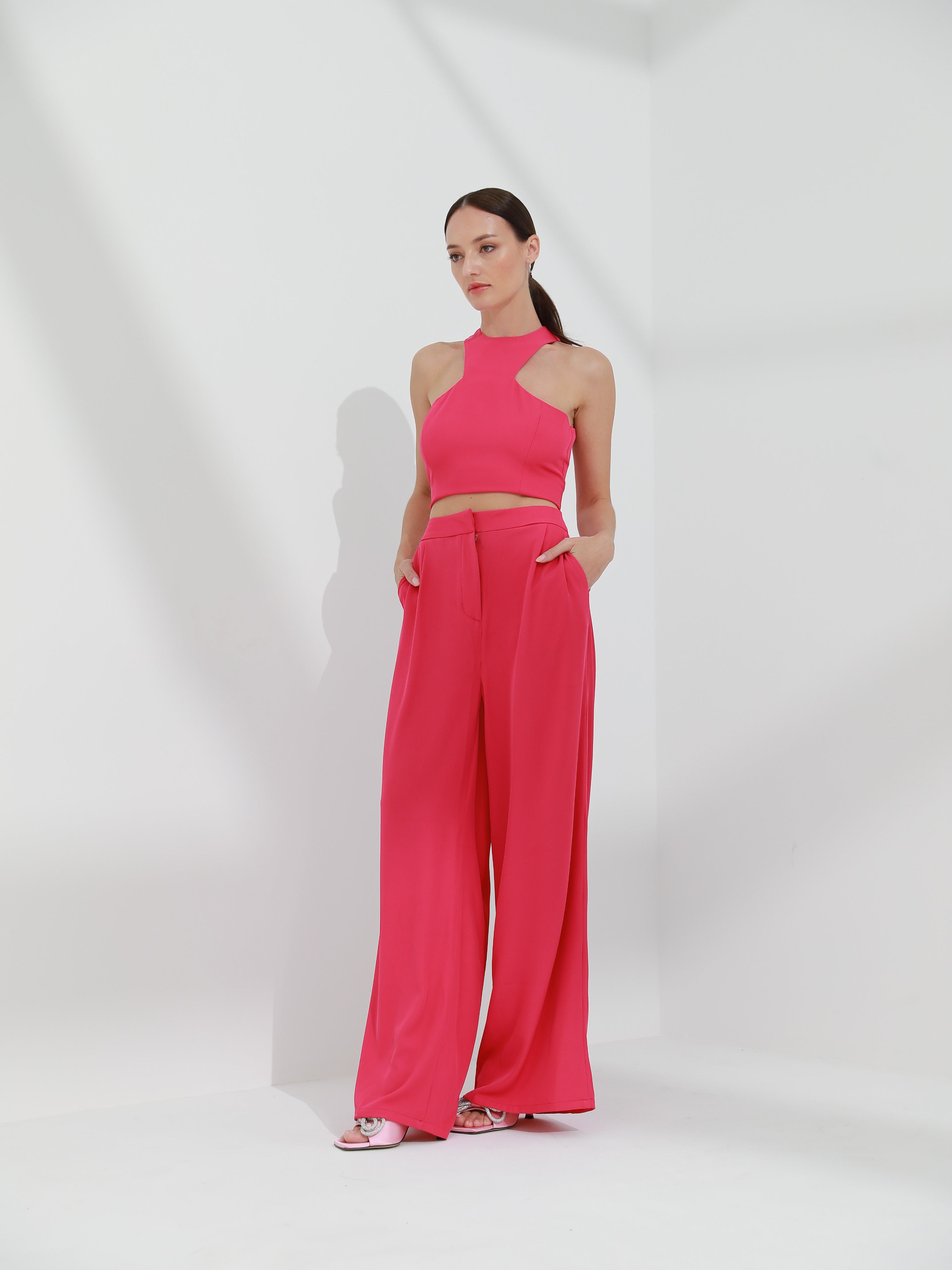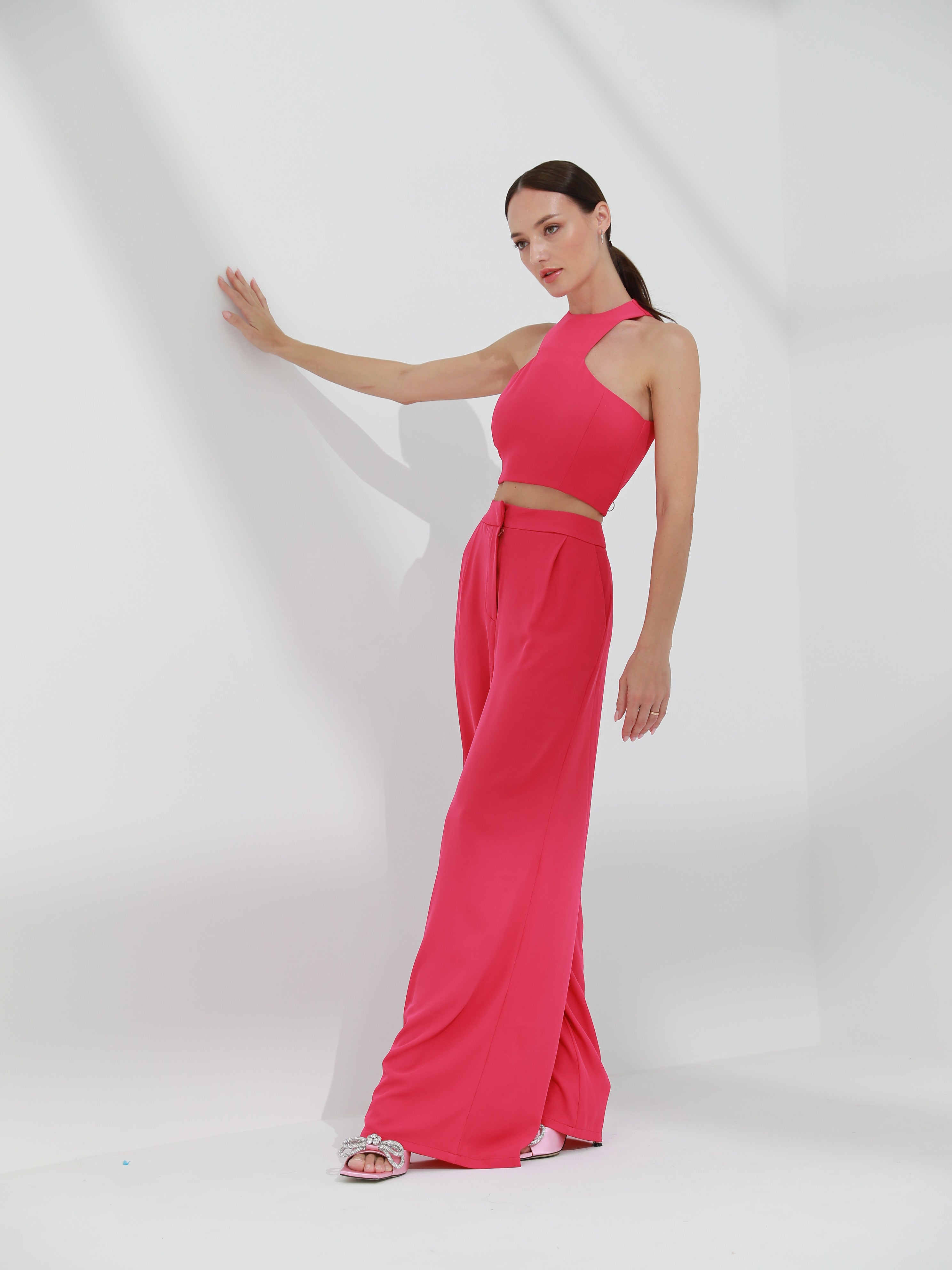This product features a vibrant hot pink color and a stylish Vesper cut crop top design, which is part of a coordinated set. It is made from lightweight crepe material, ensuring comfort and ease of wear. This versatile piece is suitable for various chic occasions, making it a must-have addition to your wardrobe.