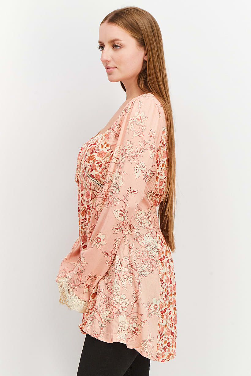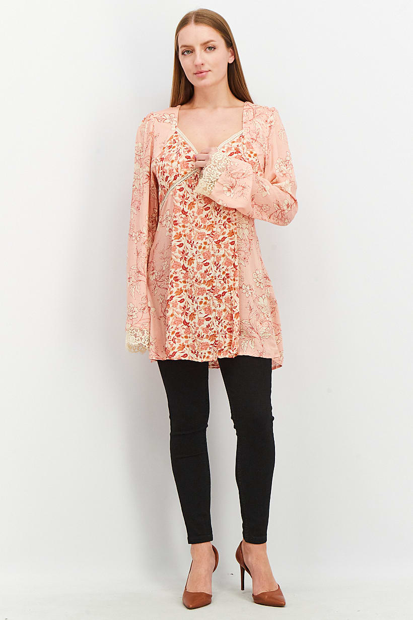 Women V Neck Long Sleeve Allover Printed Tunic Top, Pink Combo