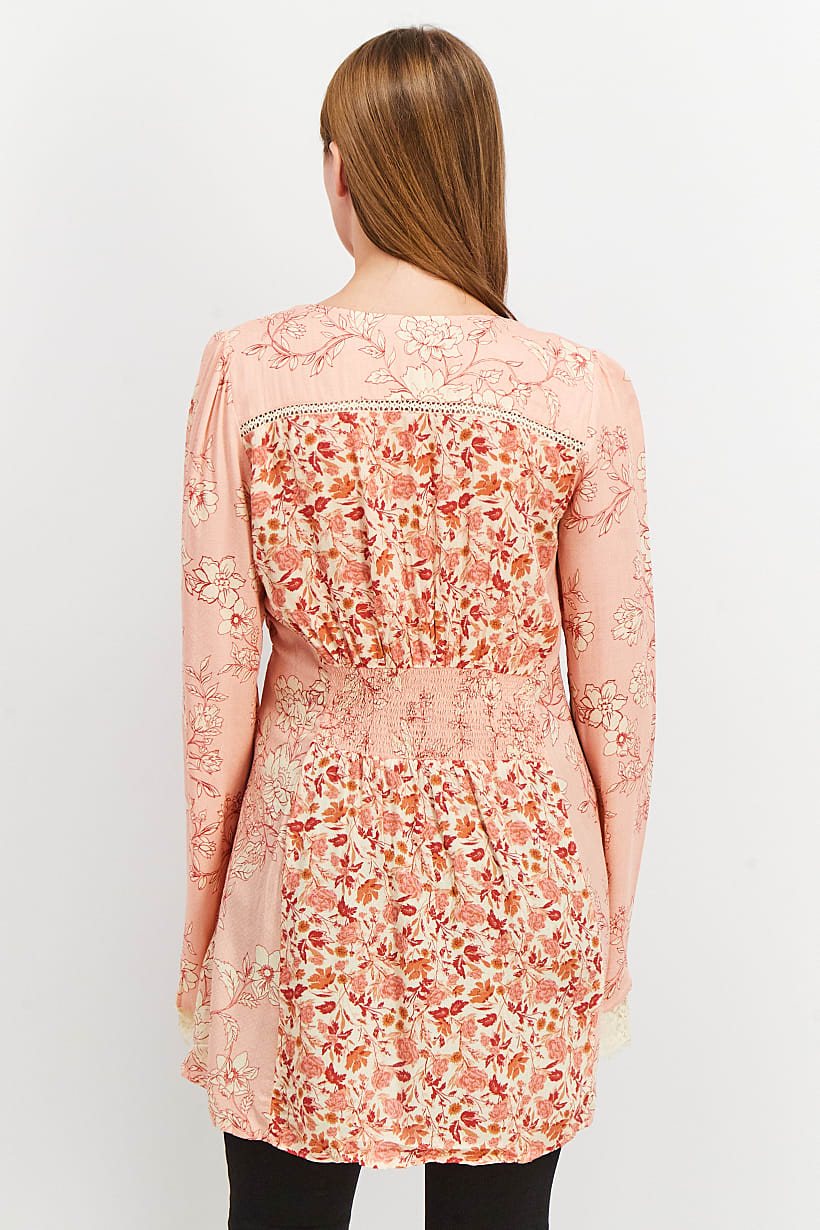 Care : Machine washable, Fit : Regular fit, Size shown : International, Top Style : Tunic, Types of Hem : Straight hem, Types of Neckline & Collar : V-neckline, Types of Sleeve : Longsleeve, Fabrics : 100% Viscose, Occasion : Casual, Pattern & Print : Allover print, Types of Closures : Pullover, Color Family : Pink,