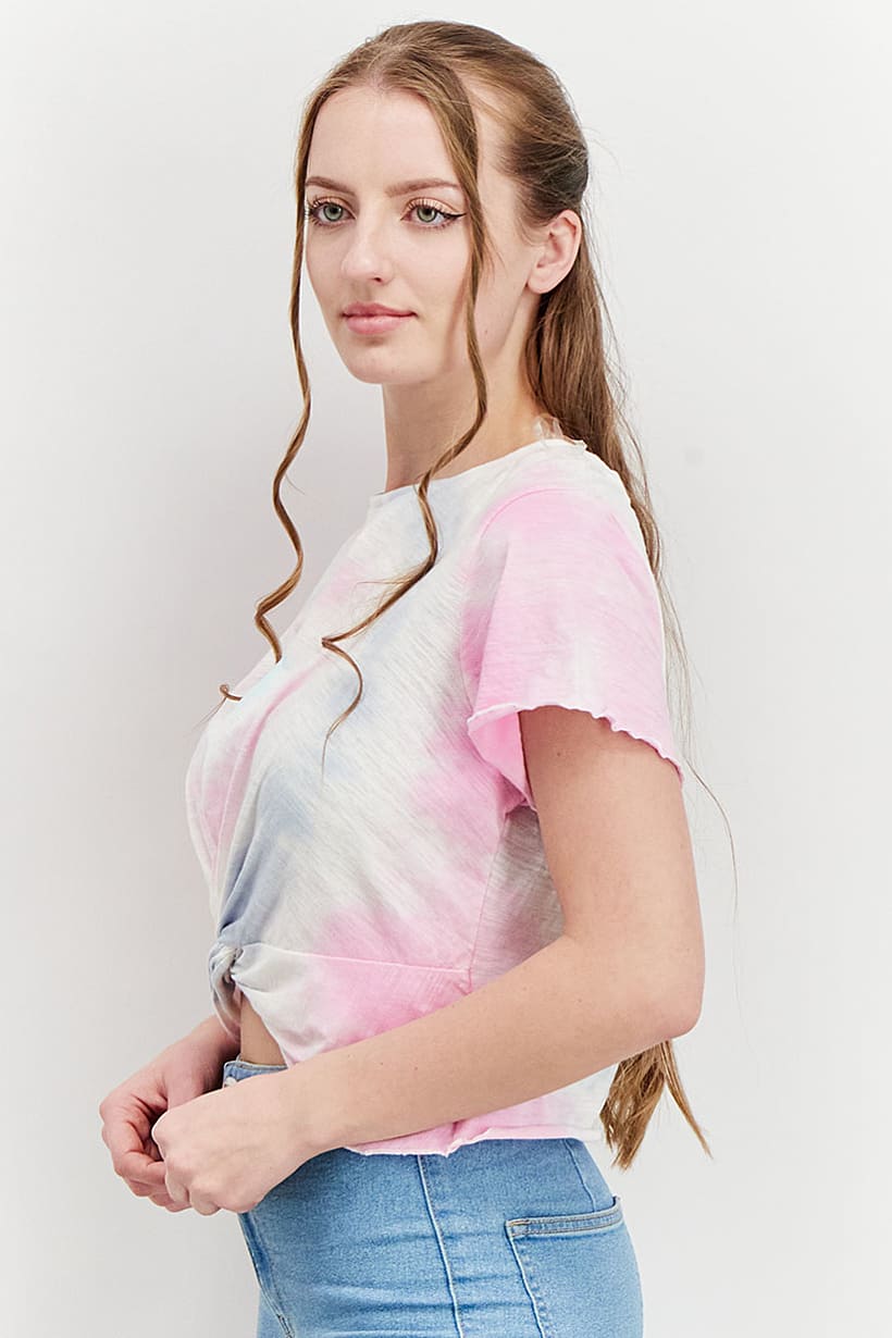 Care : Machine washable, Fit : Regular fit, Size shown : International, Top Style : Cropped, Types of Hem : Knot hem, Types of Neckline & Collar : Round neckline, Types of Sleeve : Short sleeve, Fabrics : 100% Cotton, Occasion : Casual, Pattern & Print : Tie dye, Types of Closures : Pullover, Color Family : Pink,