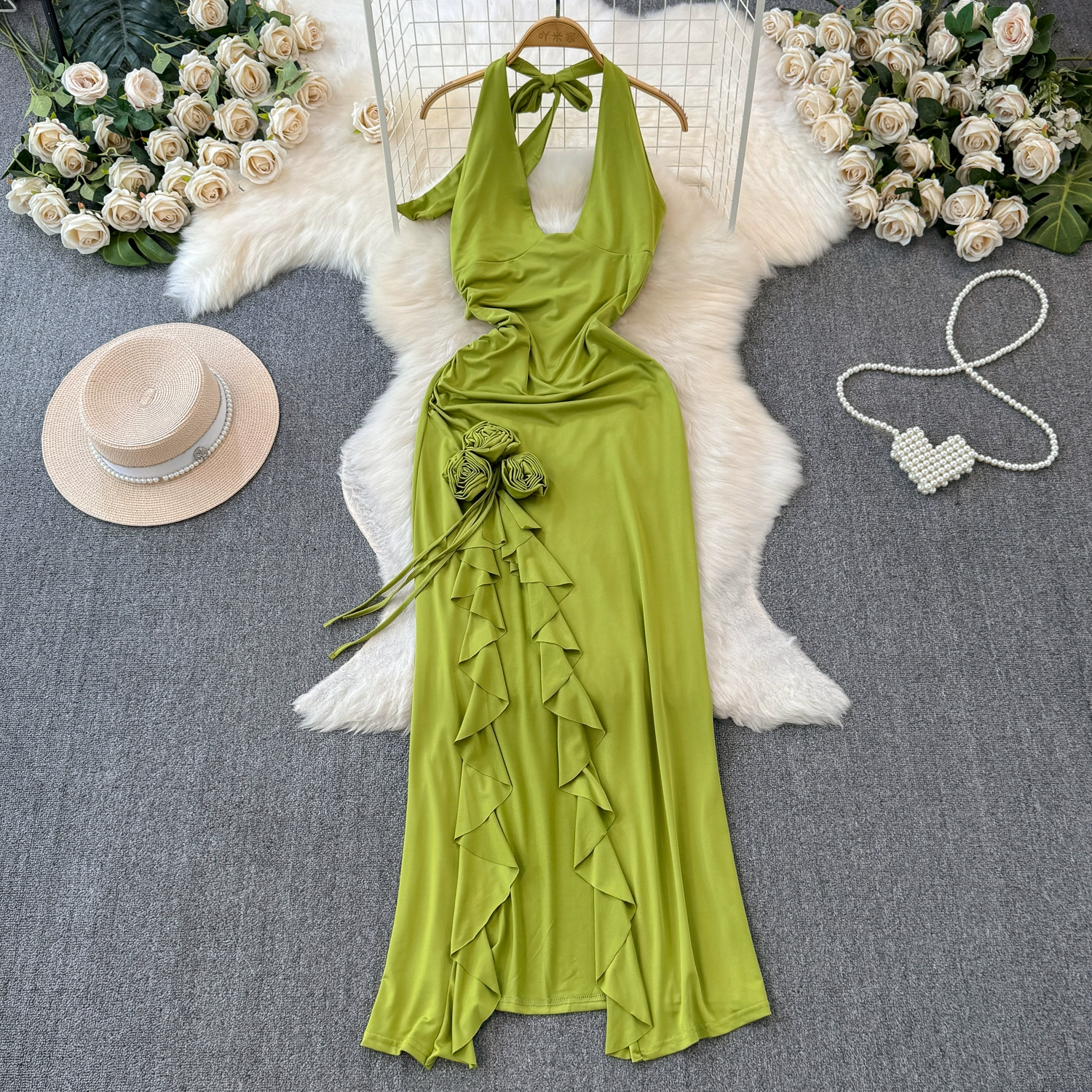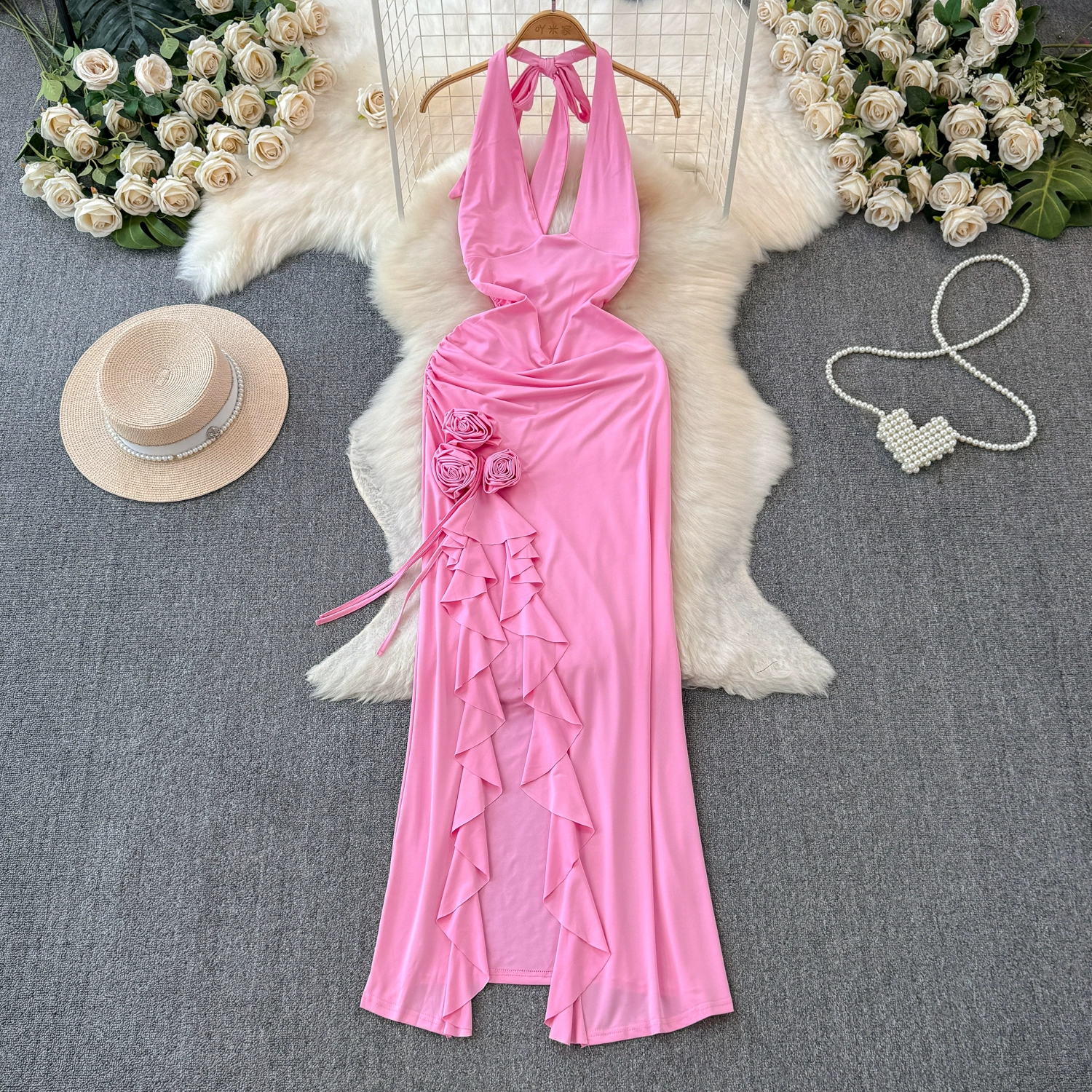 | nameOriginal | Pink dress women's French retro party toast dress sexy halter neck heavy industry three-dimensional flower slit dress |