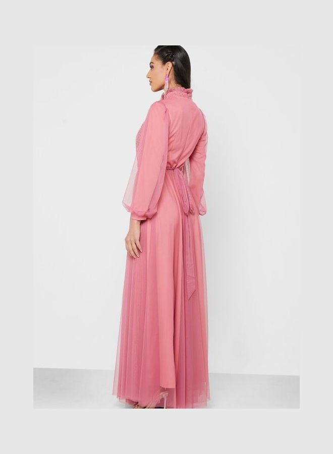 This dress is perfect for those who want to look stylish without being too flashy. Made from lightweight polyester tulle fabric, it has a flowy and flattering fit. The ruffle high neck and long sleeves add a touch of elegance, while the beaded embellishment on the front adds some sparkle. The waist is cinched with a belted detail, and the dress is secured with a zipper closure on the back.