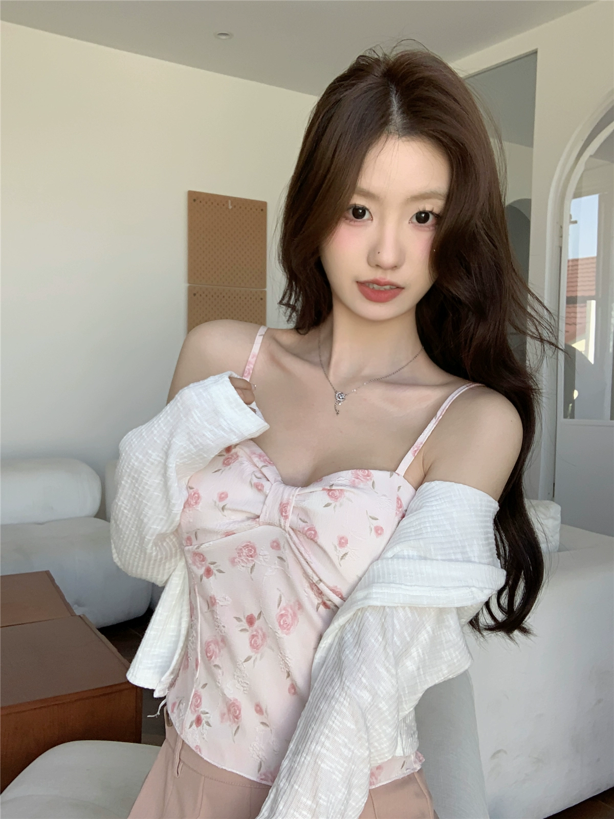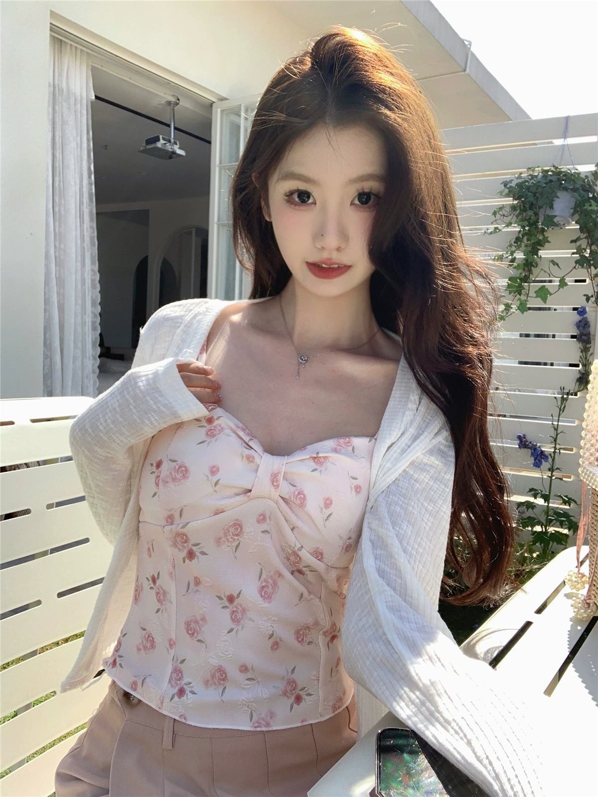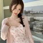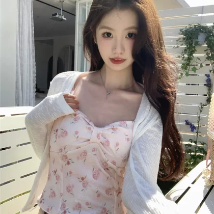 | nameOriginal | Pink floral knitted sun protection shirt suit for women with suspenders |