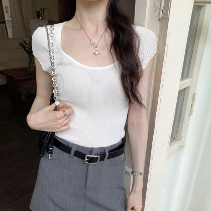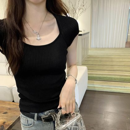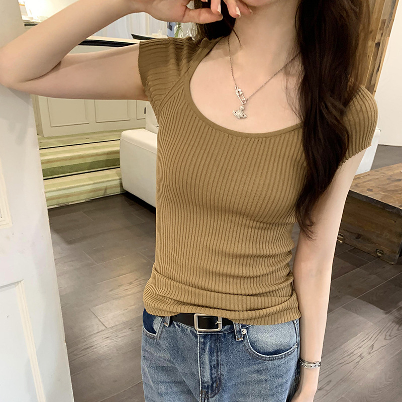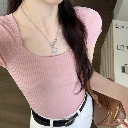 nameOriginal | Pink Gentle Slim-fit Slimming Short-sleeved Sweater Women's 2024 Summer New Niche Square Collar Pure Sweet and Spicy Top |
