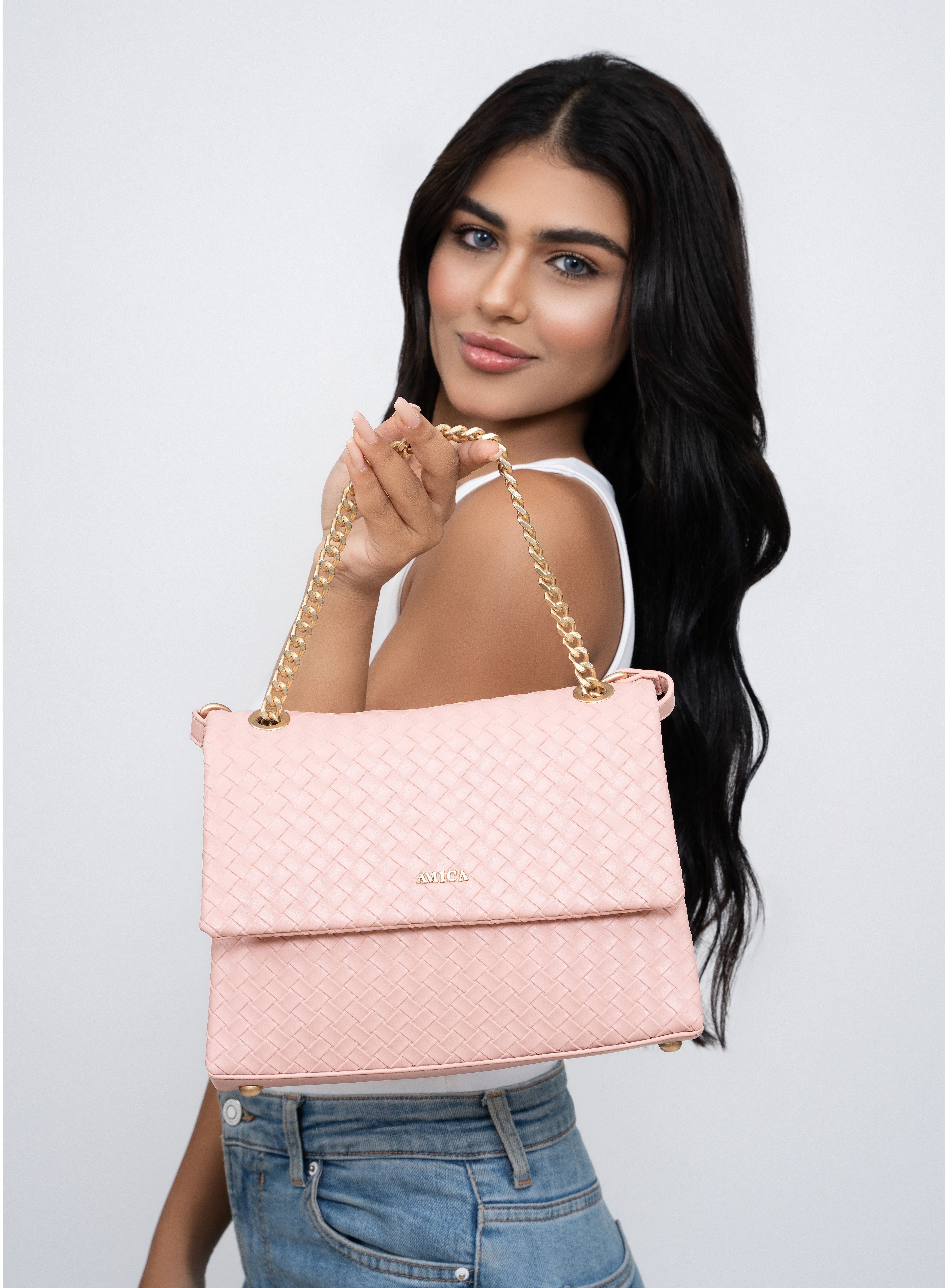 The Kelly Weave Leather Crossbody Bag in Pink is the perfect accessory for any fashion-forward individual. Made from high-quality leather, this bag is both durable and stylish. The intricate weave design adds a touch of elegance to the overall look of the bag. The pink color is perfect for adding a pop of color to any outfit. The crossbody style allows for hands-free convenience, making it perfect for everyday use or a night out on the town. The bag features a spacious interior with multiple pockets to keep your essentials organized. The adjustable strap allows for a customizable fit, making it comfortable to wear all day long. This bag is a must-have for anyone looking to elevate their style while still maintaining practicality.