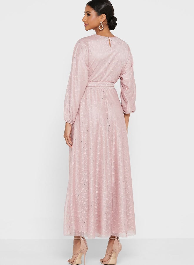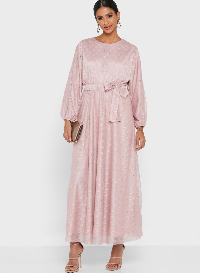 Add a touch of femininity and glamour to your evening dress collection with this stunning mesh dress. Crafted from a soft and comfortable blend of polyester, it features a round neck, long sleeves, and an adjustable waistbelt with self-tie straps. The keyhole back with button top closure adds a touch of allure to this beautiful dress.