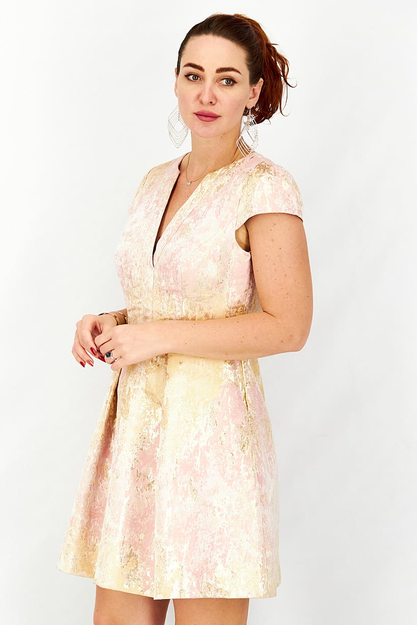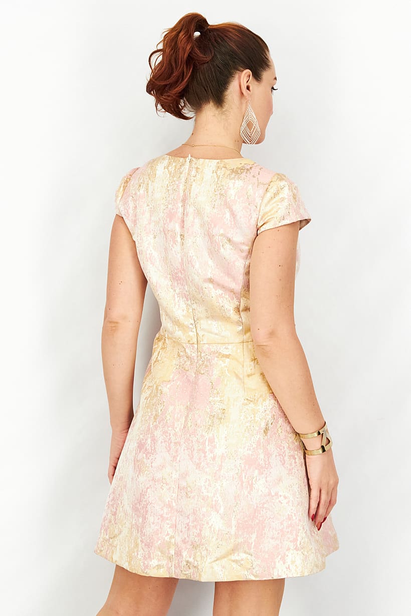 | descriptionOriginal | Care : Hand wash, Dress Style : Midi, Fit : Regular fit, Size shown : US, Types of Hem : Straight hem, Types of Neckline & Collar : V-neckline, Types of Sleeve : Cap sleeve, Disclaimer : Product color may slightly vary due to photographic lighting sources or your monitor settings., Fabrics : 84% Polyester, 16% Metallic, Occasion : Casual, Pattern & Print : Metallic, Types of Closures : Concealed zipper, Color Family : Pink, |