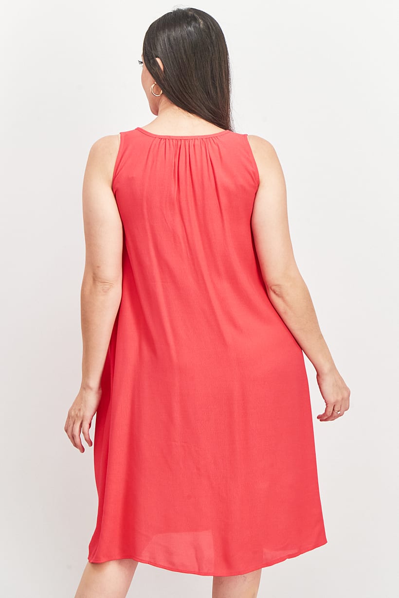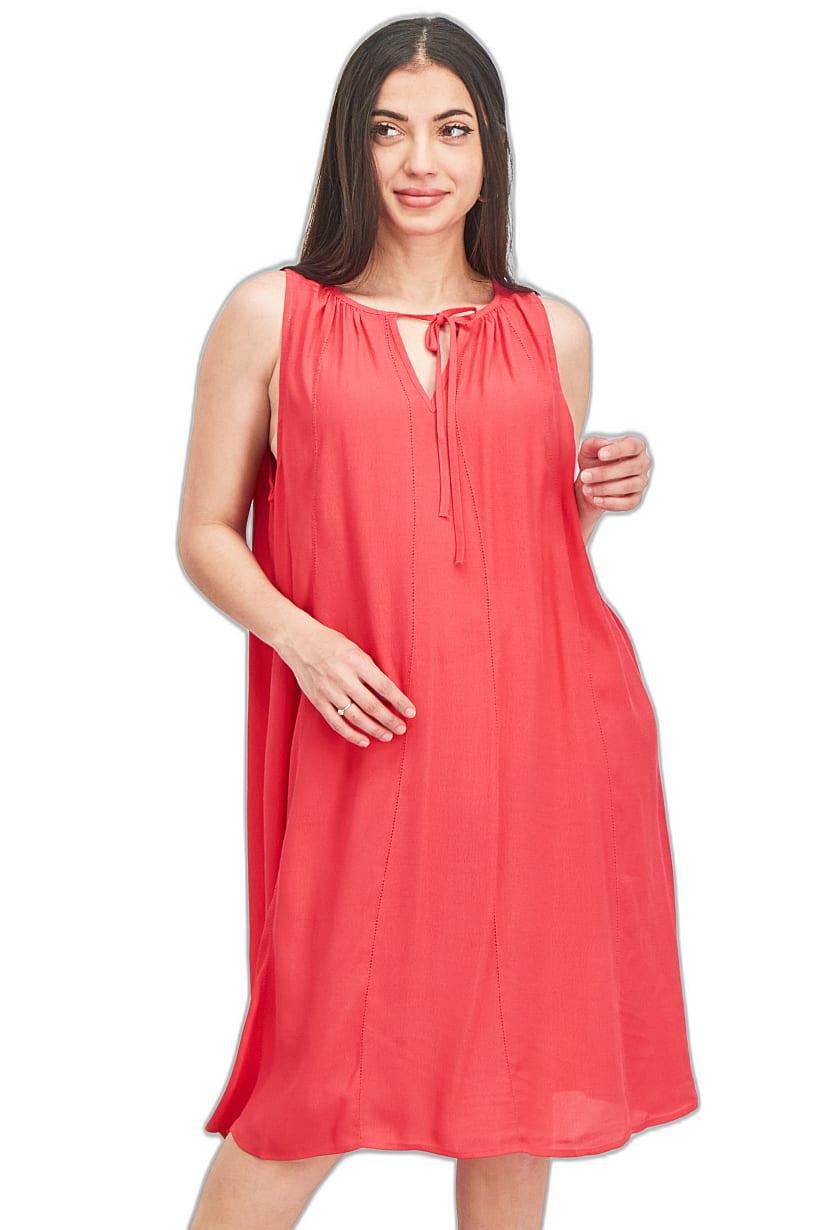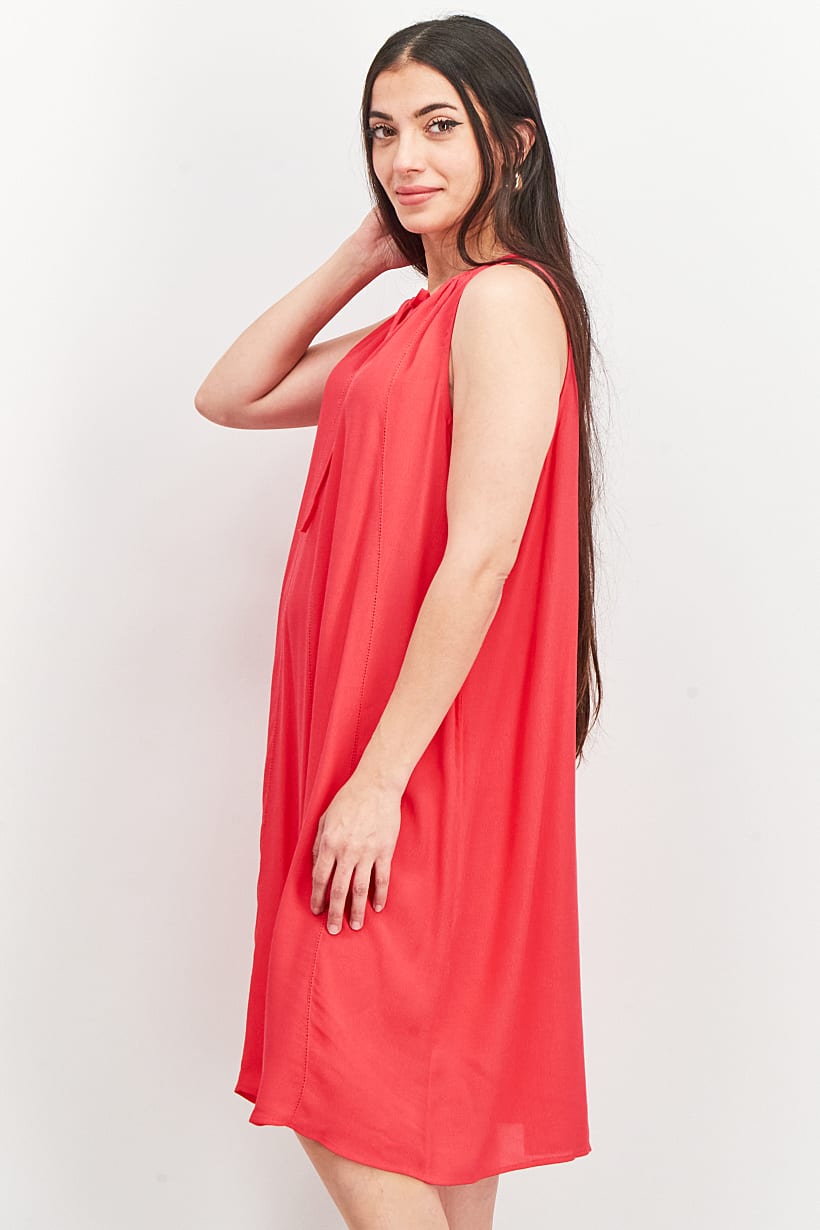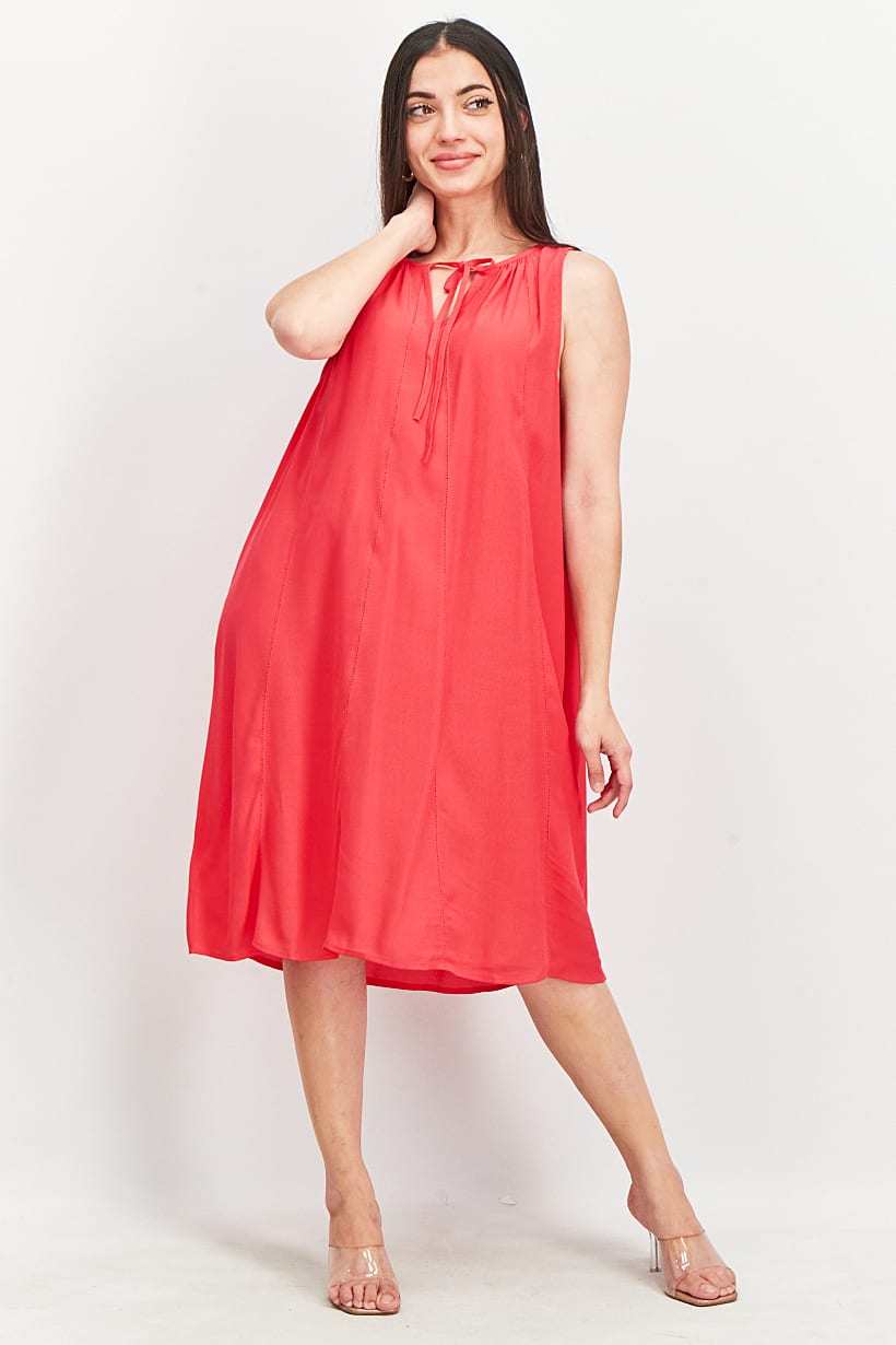 This product requires hand washing and features a midi dress style with a regular fit. The size shown is in US measurements and has a straight hemline. The neckline and collar are tied, while the sleeves are sleeveless. Please note that the product color may vary slightly due to lighting or monitor settings. Made from 100% viscose fabric, this dress is suitable for casual occasions and has a plain/solid pattern. It also has a tie closure and comes in a pink color family.