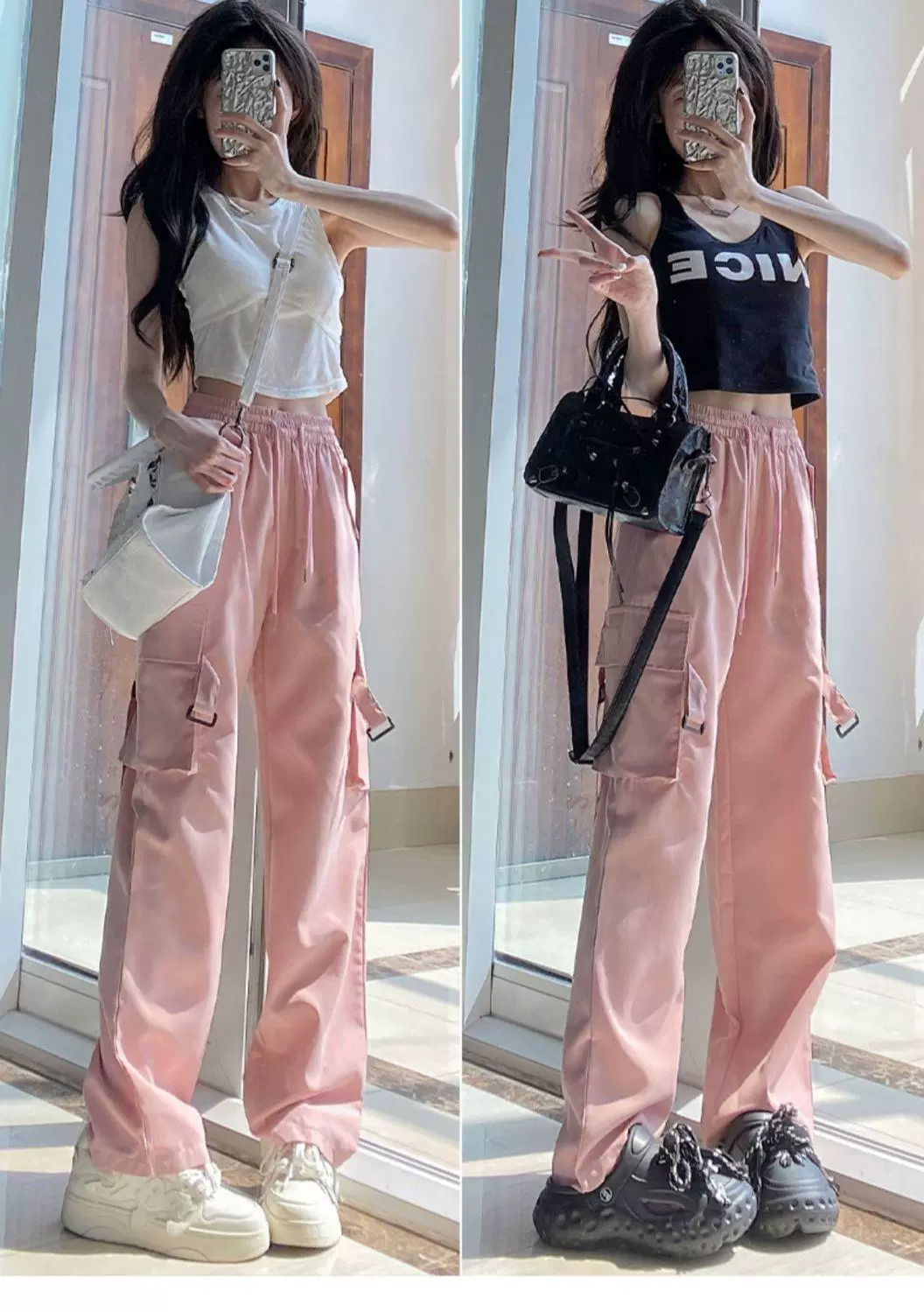 | nameOriginal | Pink overalls for women in the summer, large size, high waist, slim and drapey, wide leg, narrow version, casual American straight sports pants |