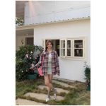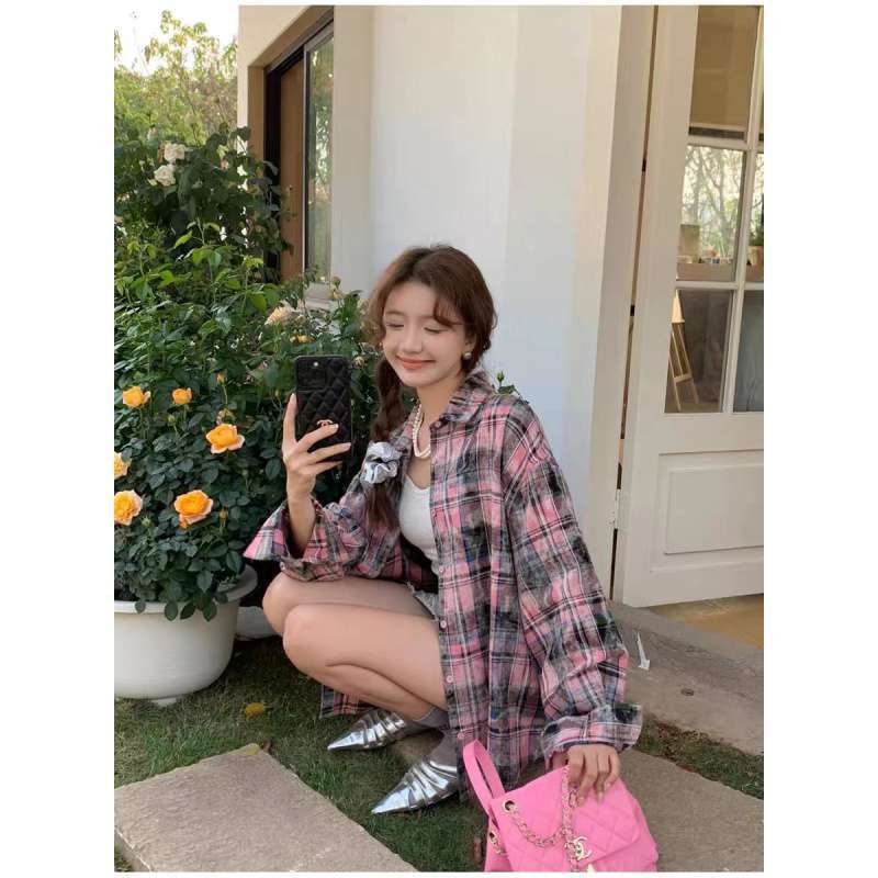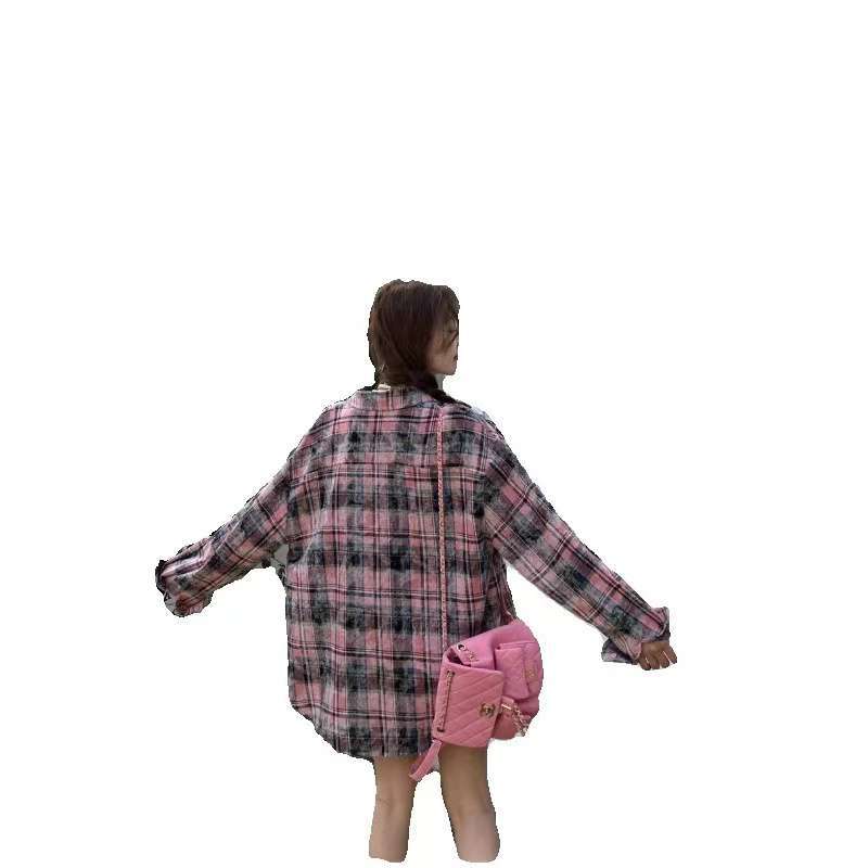 Pink Plaid Shirt Women’s Retro Hong Kong Style Spring and Autumn New Loose Korean Style Long Sleeve Design Niche Shirt