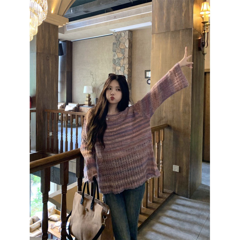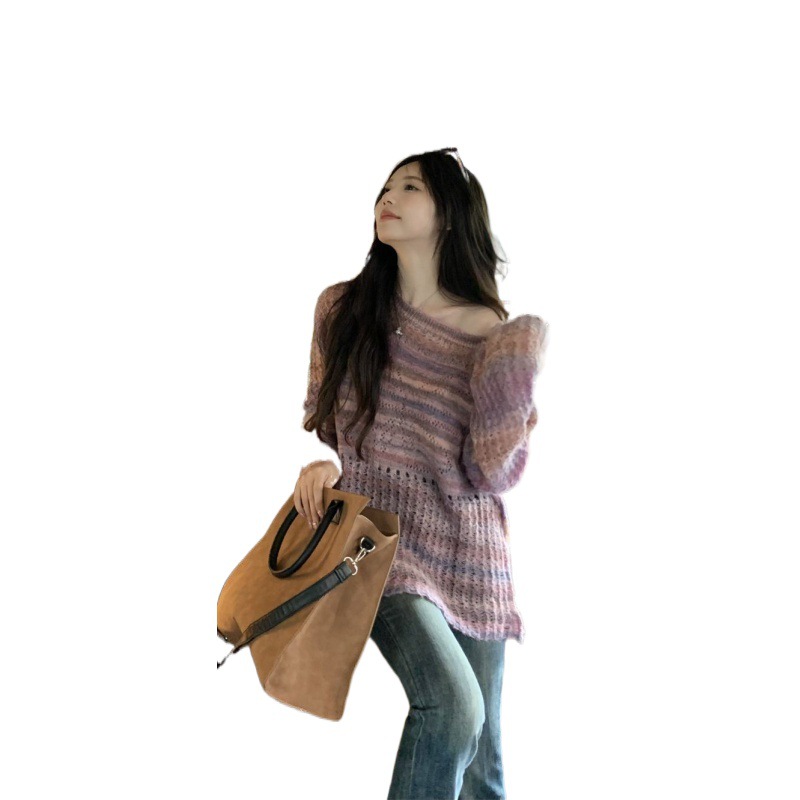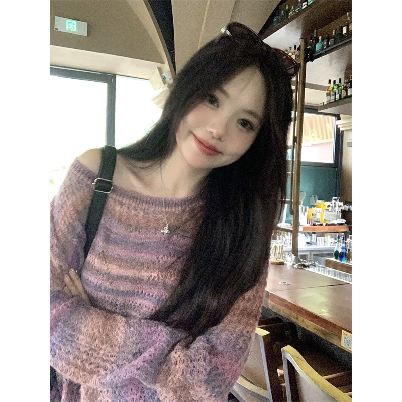 | nameOriginal | Pink Purple Lazy Style Soft Waxy Pullover Sweater Women's Autumn Long-Sleeved Open-Shoulder Hollow Color Outer Wear Top |