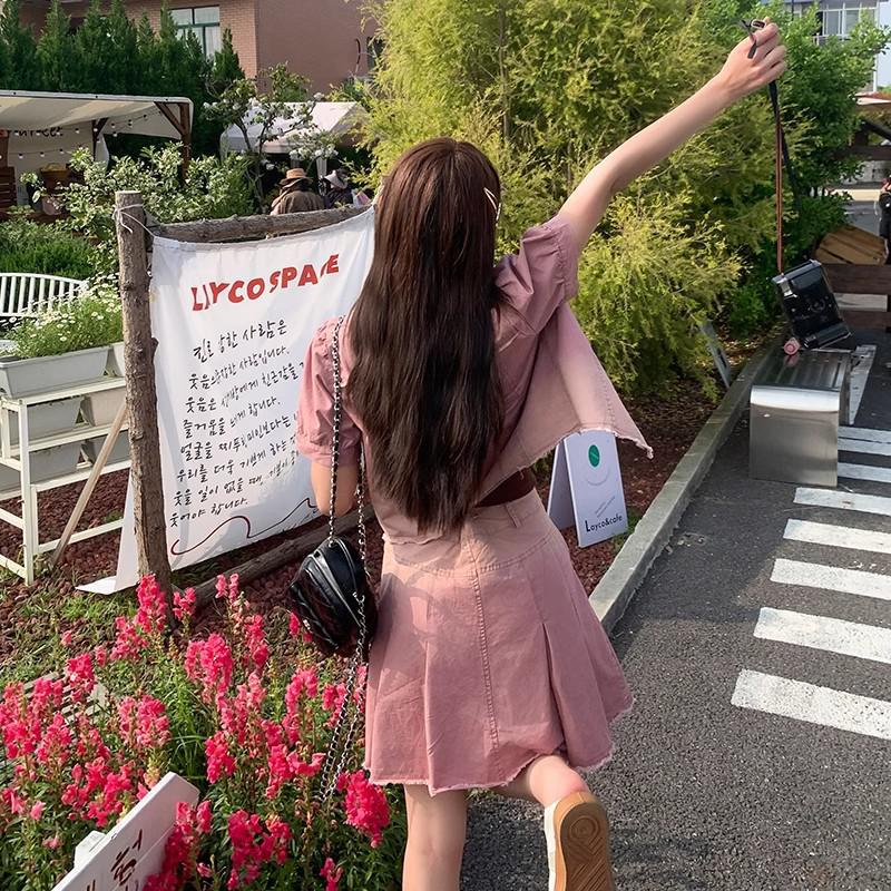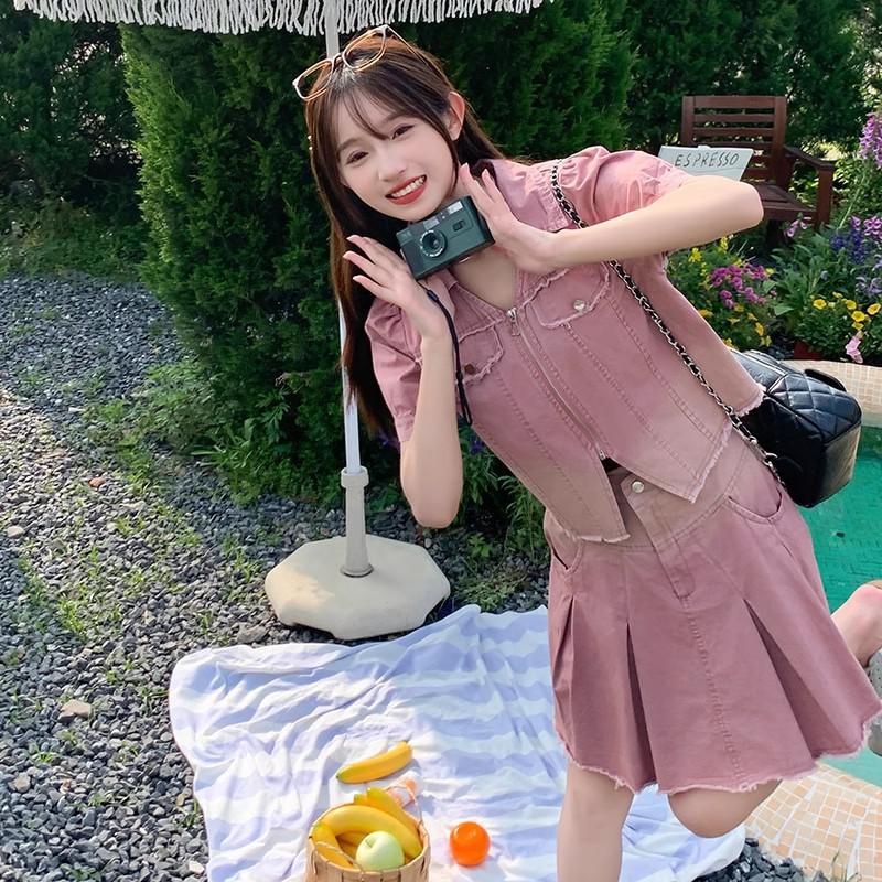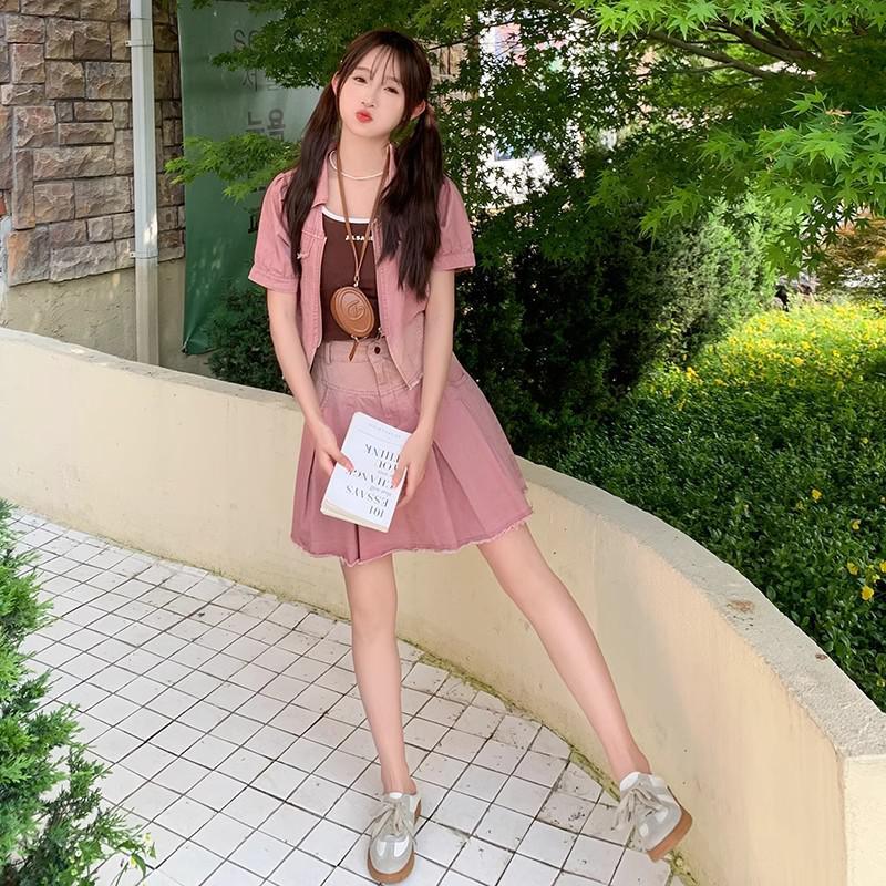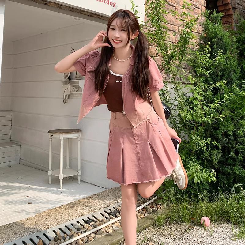 | nameOriginal | Pink Retro Denim suit Women's Summer 2024 New Style Small Sweet Cool Age-reducing Casual Top Skirt Two-piece Set |