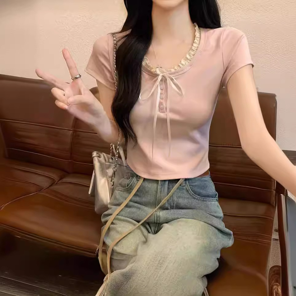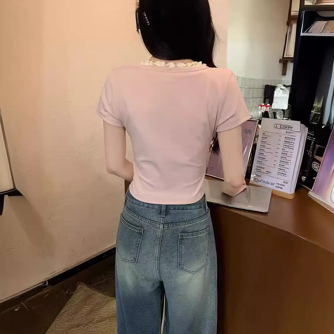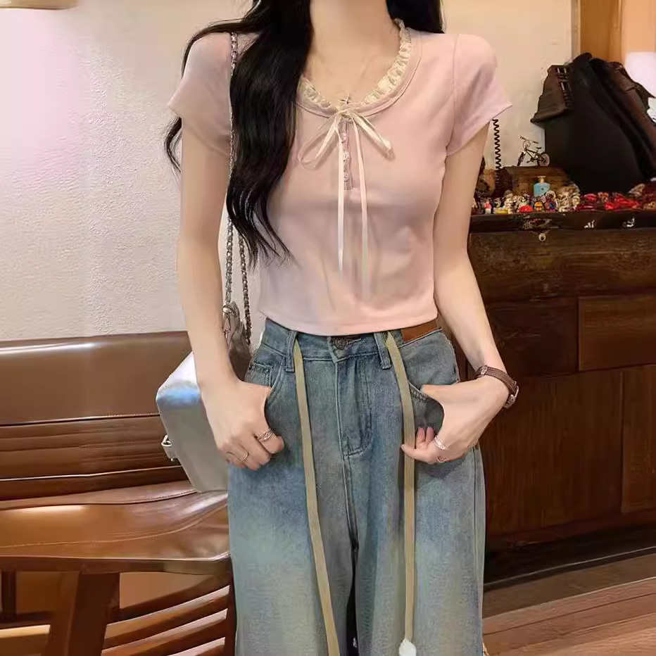 | nameOriginal | Pink Short-sleeved T-shirt Women's Summer Pure Ear Bow Shoulder Slim-fit Spice Girl Fake Two-piece Short Top |