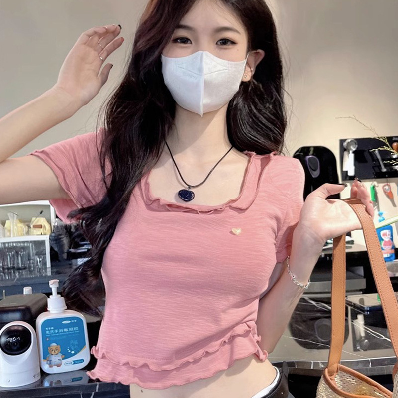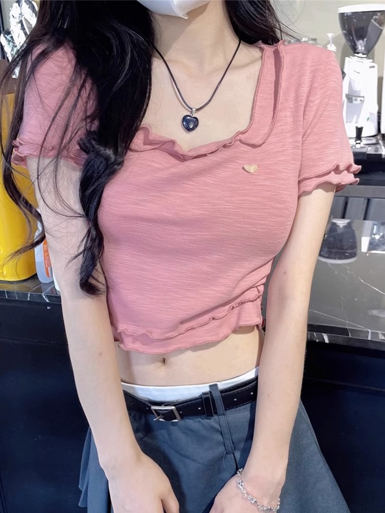 Pink Square Collar Shoulder Short-sleeved T-shirt Women's Summer Cotton Design Niche High Waist Short Wood-ear Top Trendy