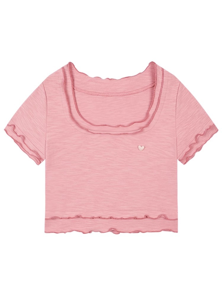 Pink Square Collar Shoulder Short-sleeved T-shirt Women’s Summer Cotton Design Niche High Waist Short Wood-ear Top Trendy