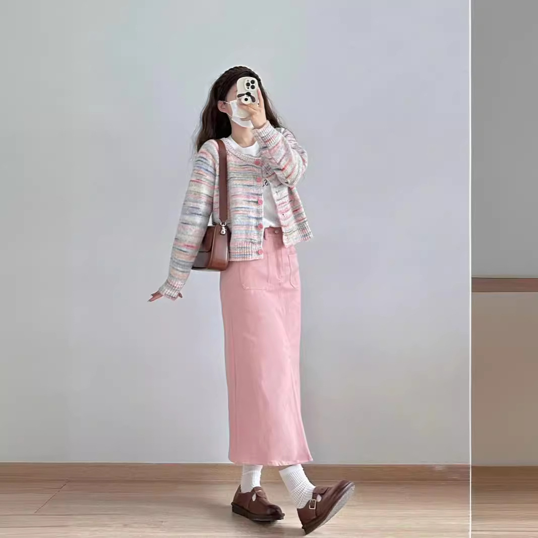 Pink Striped Knitted Cardigan Sweater Women’s Early Autumn and Winter 2024 New Retro Japanese Lazy Style Coat Top
