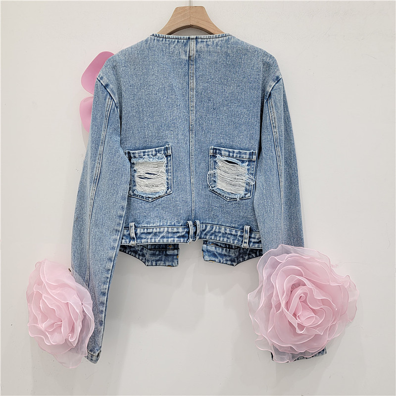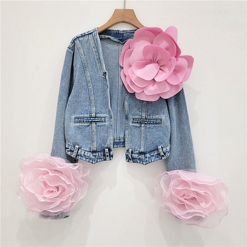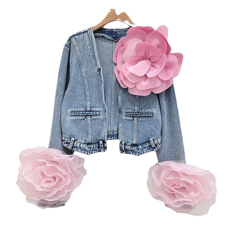 | nameOriginal | Pink Stylish Three-dimensional Flower Design Denim Jacket Women's Personalized V-neck Stylish Casual All-match Short Top |