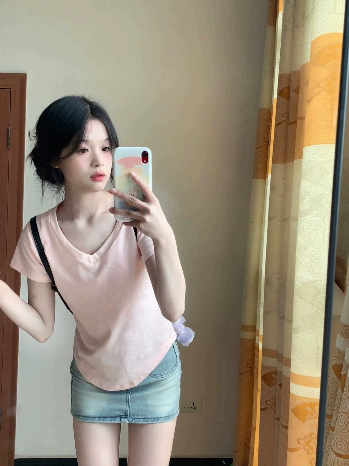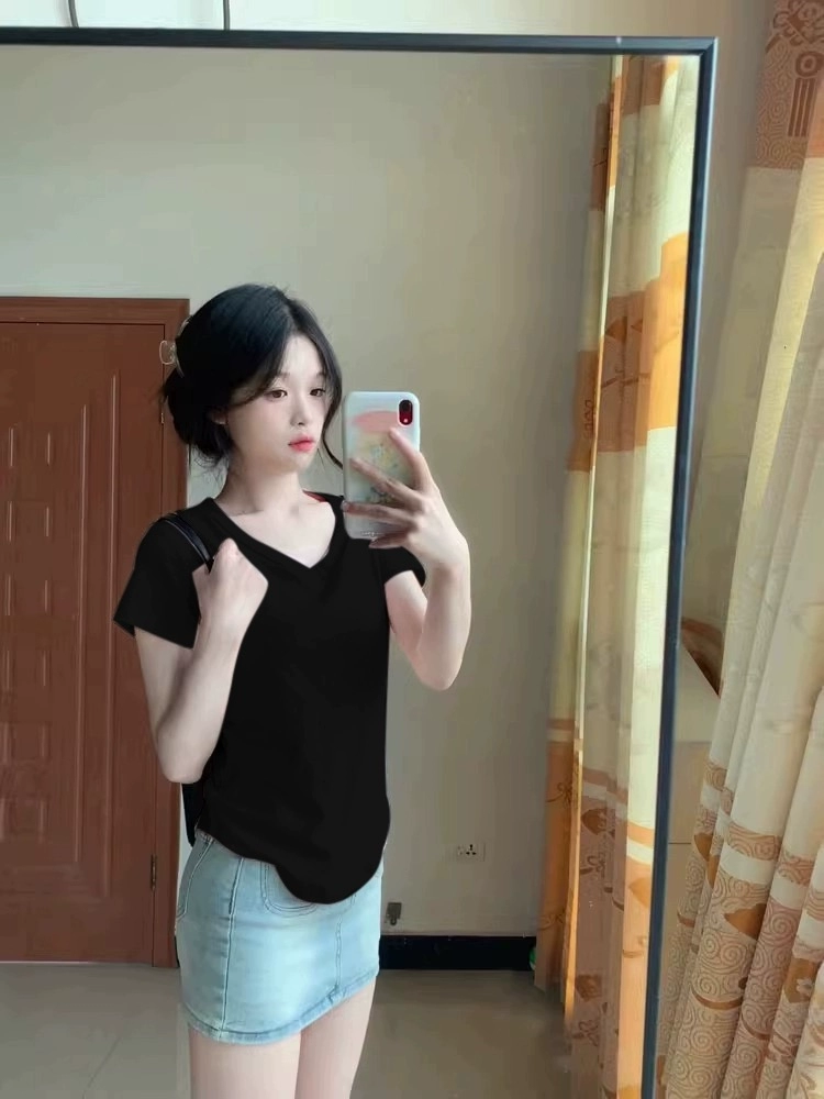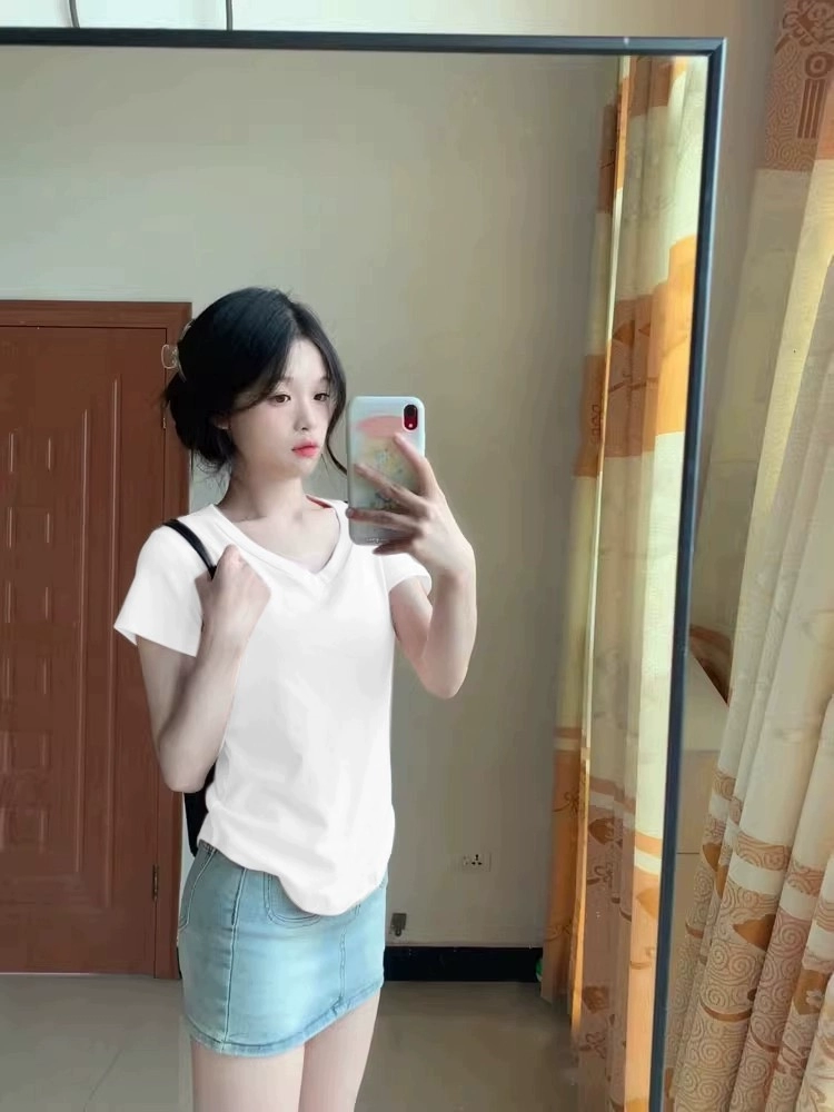 | nameOriginal | Pink V-neck right shoulder slim fit hot girl short-sleeved T-shirt |