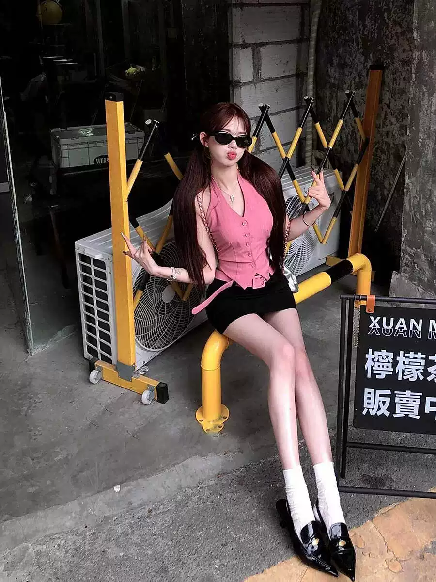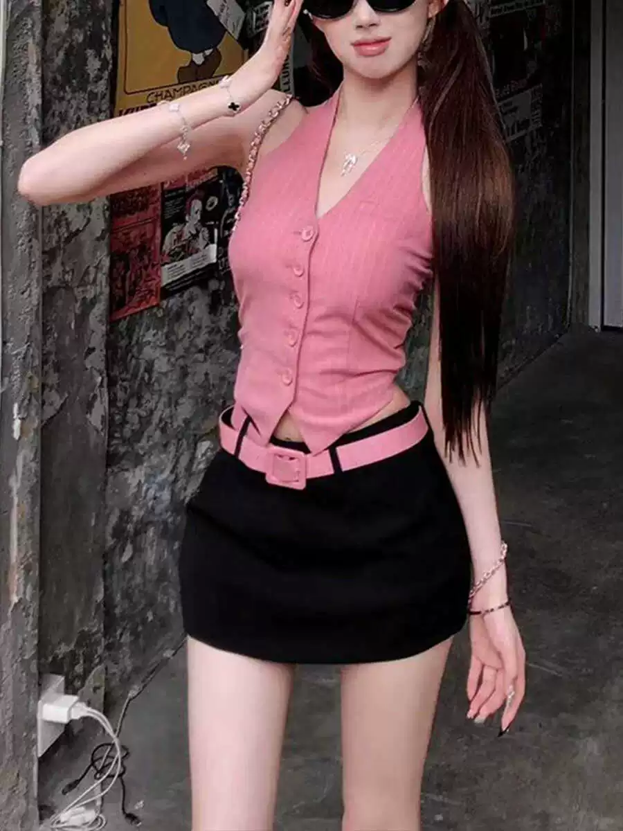 Pink V-neck Sleeveless Vest Hot Girl Backless Halter Neck