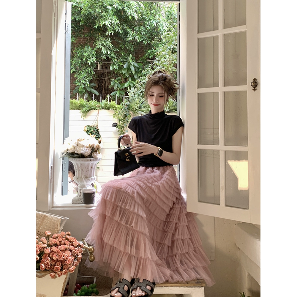 | nameOriginal | Pink women's summer French style slimming long skirt mesh |