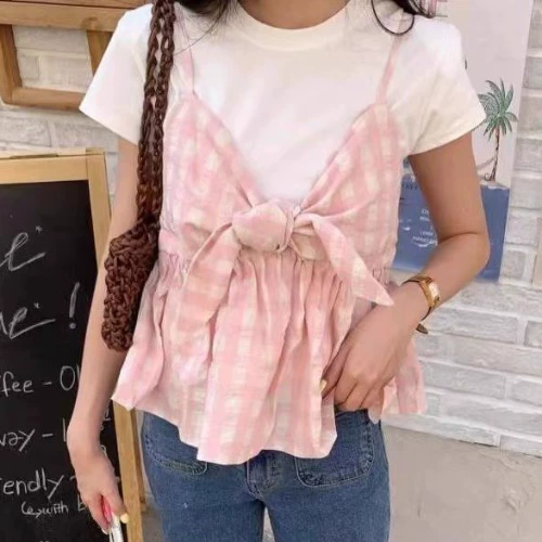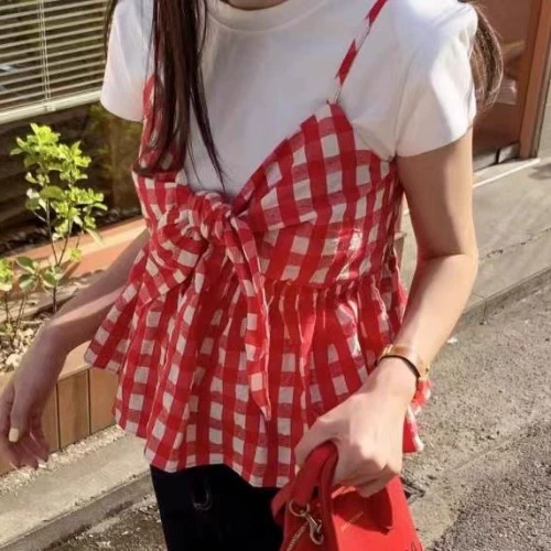 | nameOriginal | Plaid camisole women's summer outer wear Hong Kong style sexy V-neck bow sweet and fashionable inner short top |