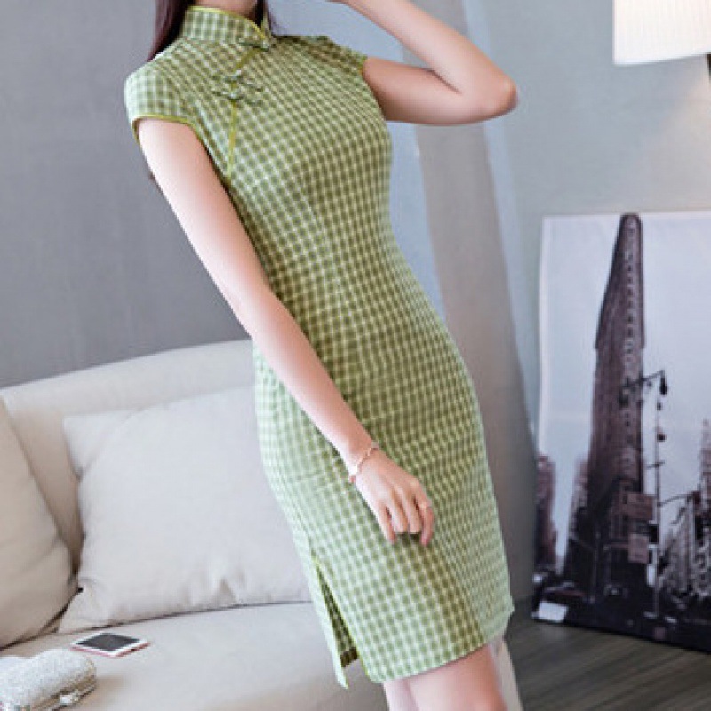 | nameOriginal | Plaid Cotton Linen Cheongsam Summer Ethnic Style Low Slit Cheongsam dress with Vertical Collar and Buckle Women's Cheongsam Dress |