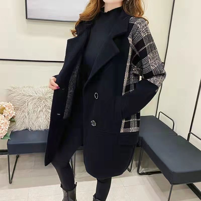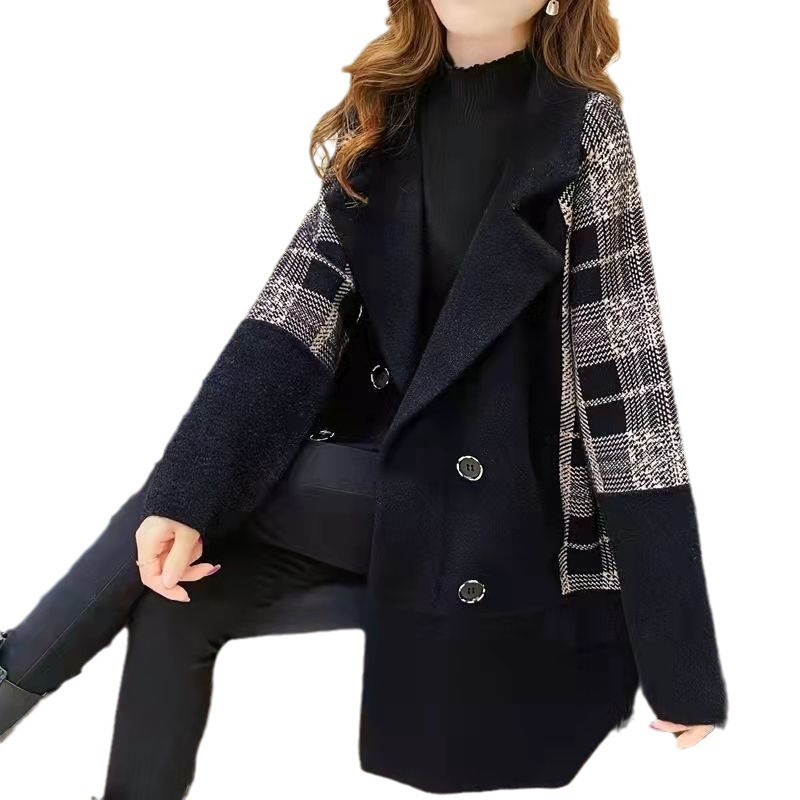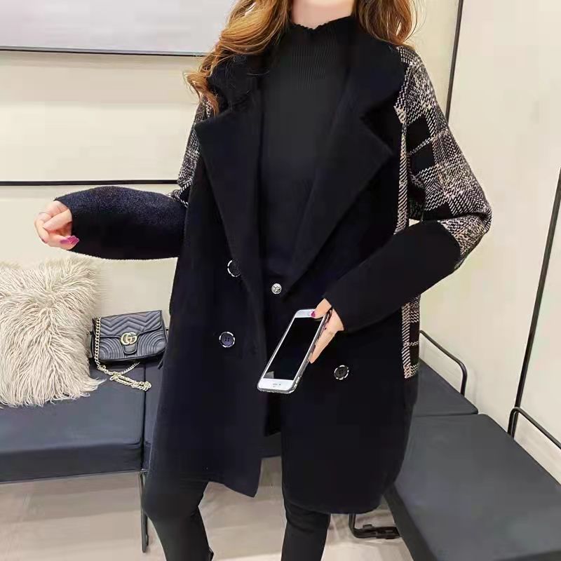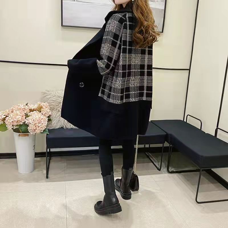 Plaid Mink Fleece Coat Women’s 2024 Autumn and Winter Mid-length Stitching Loose Hepburn Black Coat