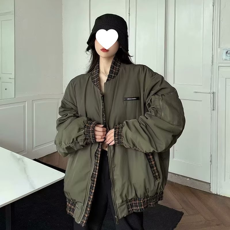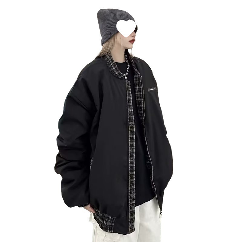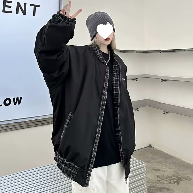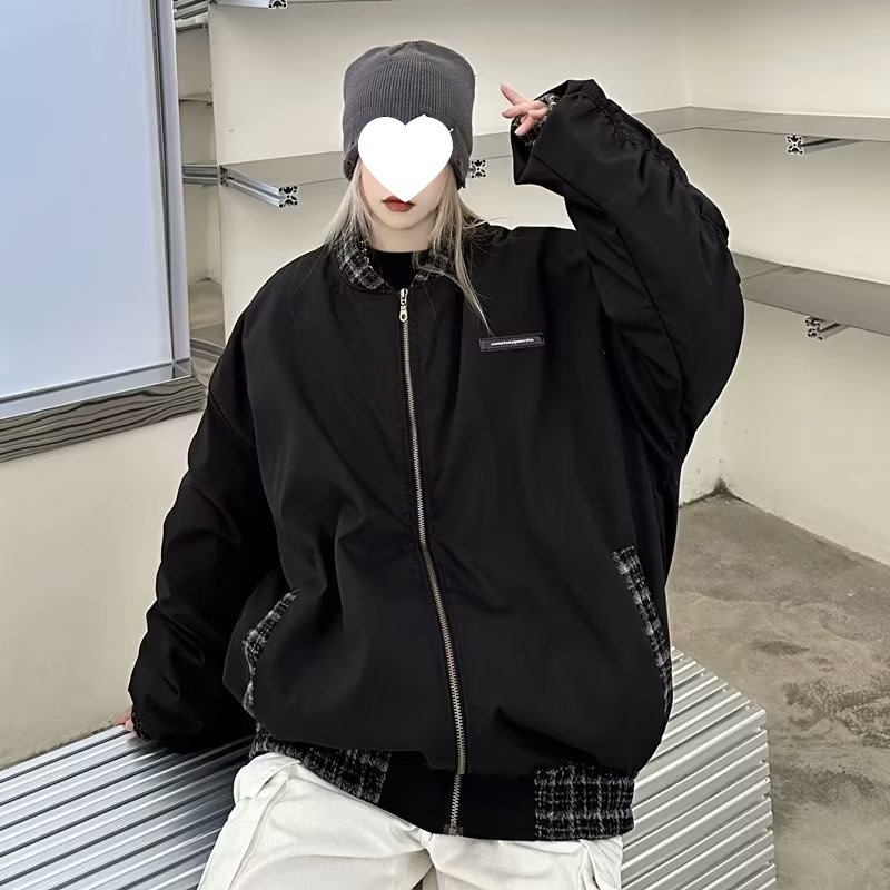 Plaid Stitching Trendy Brand Baseball Suit Women's 2023 Spring and Autumn Hong Kong Style Retro Loose Collar Jacket Couple's Trendy Coat