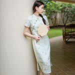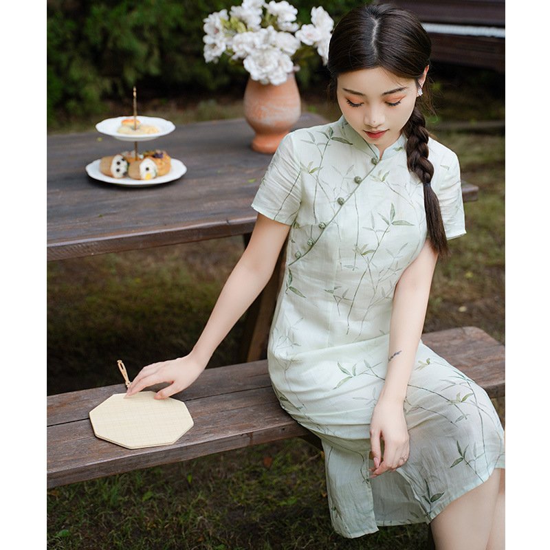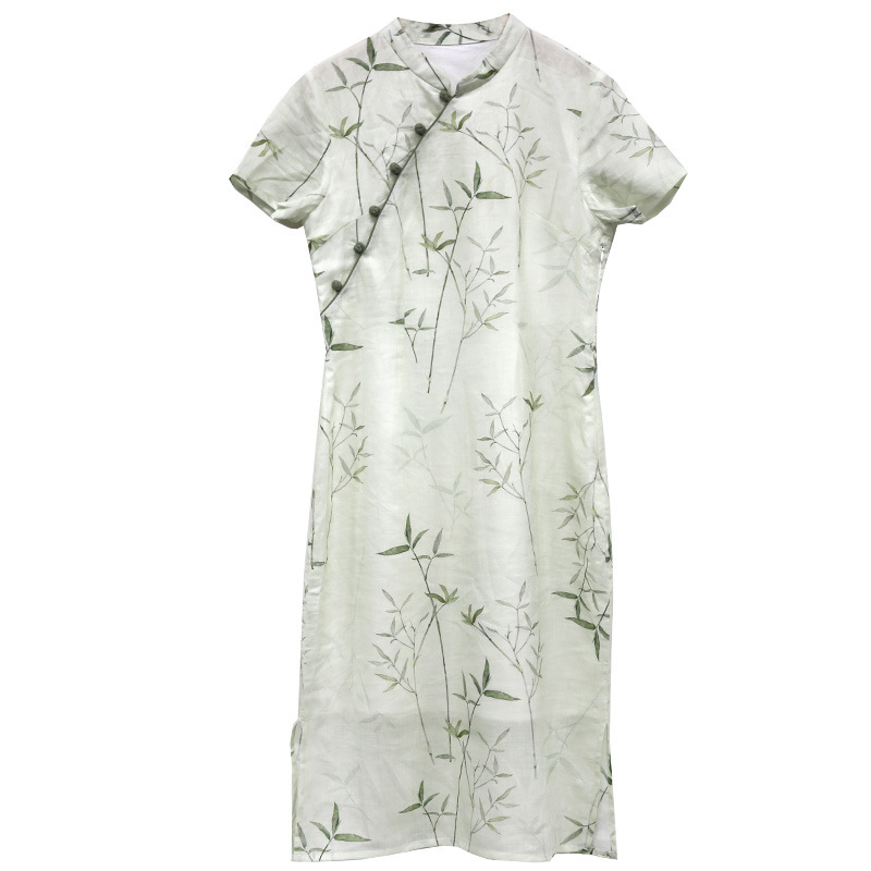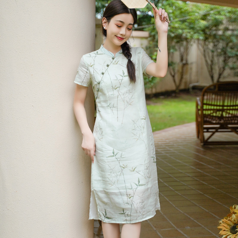 | nameOriginal | [Plain brocade] Ramie printed improved stand collar cheongsam daily young waist slimming mid-length dress |