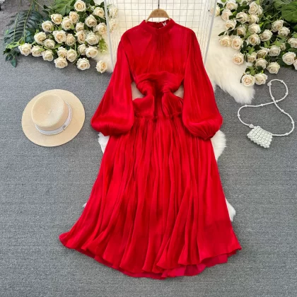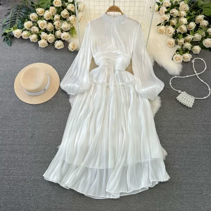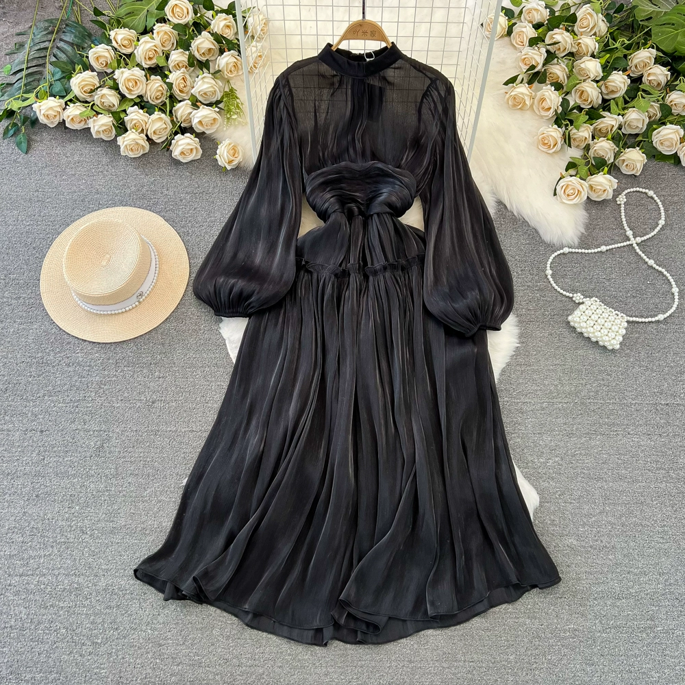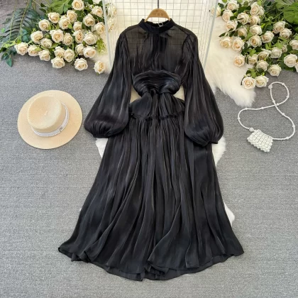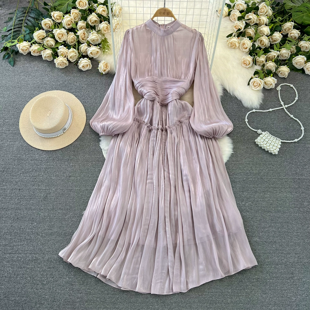 | nameOriginal | Pleated Korean style lantern long sleeve stand collar sequin dress |